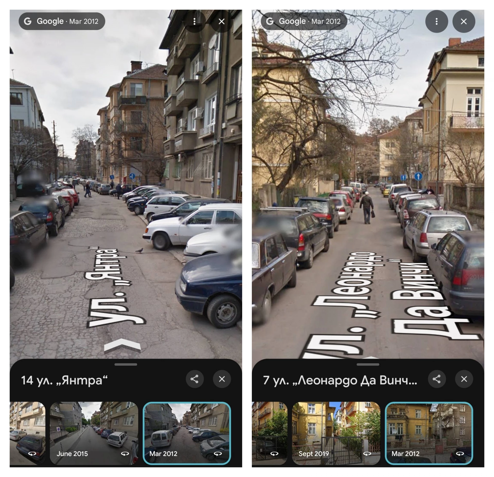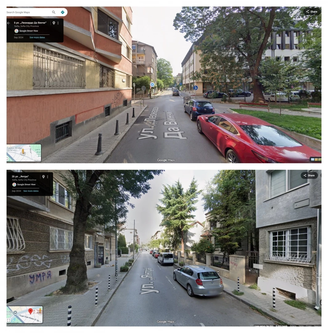 Отново ул. "Янтра" и ул. "Леонардо да Винчи" в кв. "Яворов", но през 2024 г., източник: Google Maps, колаж: Actualno.com