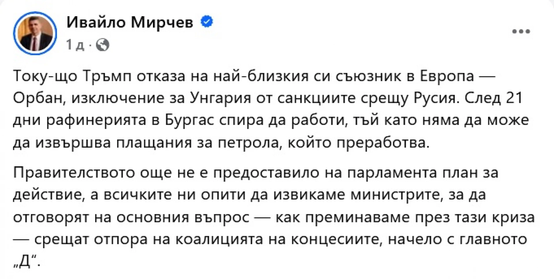 Поведението по темата бих го обобщил с манипулативния тон на Ивайло Мирчев от ПП-ДБ – разбира се, в социалните мрежи, защото там е най-лесно да няма опоненти. Защо точно с него - защото е представител на политическата сила в България, която най-силно се асоциира с някакво подобие на морал. Мирчев хвърли гръмкото твърдение: "Току-що Тръмп отказа на най-близкия си съюзник в Европа — Орбан, изключение за Унгария от санкциите срещу Русия. След 21 дни рафинерията в Бургас спира да работи, тъй като няма да може да извършва плащания за петрола, който преработва". Едно по едно – Тръмп и Орбан тепърва ще се срещнат на 7 ноември, така че окончателен отказ още няма. Орбан и Унгария открито купуват руски петрол, България поне не е толкова глупава да афишира, рекламира и изтъпанчва такава политика. Така че въпросът с изключението за нас като минимум удължаване на периода да няма санкции стои доста по-различно. Интересно Мирчев защо не каза как Сърбия 8 месеца се спаси от санкции срещу НИС, а там влиянието на Путин е по-силно дори от това у нас? Защо не този аргумент, а Орбан и то думи на Тръмп от "Еър Форс Едно", че "не сме дали разрешение" в явен контекст "засега". Та не е нужно това да го изопачаваш, за да покажеш сериозността на темата - изопачаването само дразни тези, които още имат капацитет в главата и им пука. Всява разделение, не обединение - Още: Мирчев: Тръмп отказа изключение за руския петрол на Унгария, след 21 дни спира рафинерията в Бургас (ВИДЕО)