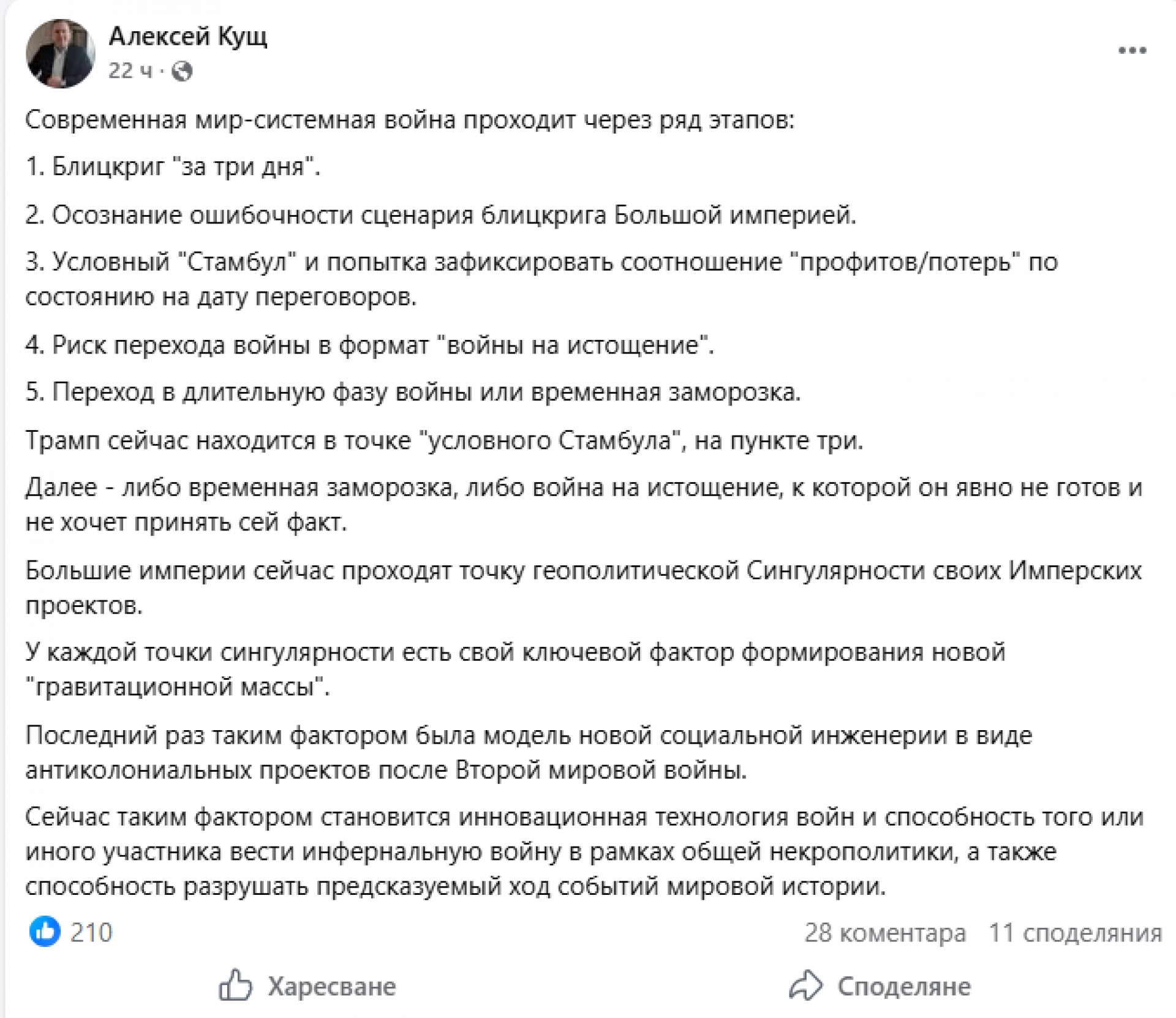 Но нека да видим кои са тези 5 етапа? Според Олексий Кущ, украински икономически експерт и финансов анализатор, част от мозъчния тръст "Единна Украйна" и бивш президентски съветник, етапите на съвременните войни са следните: