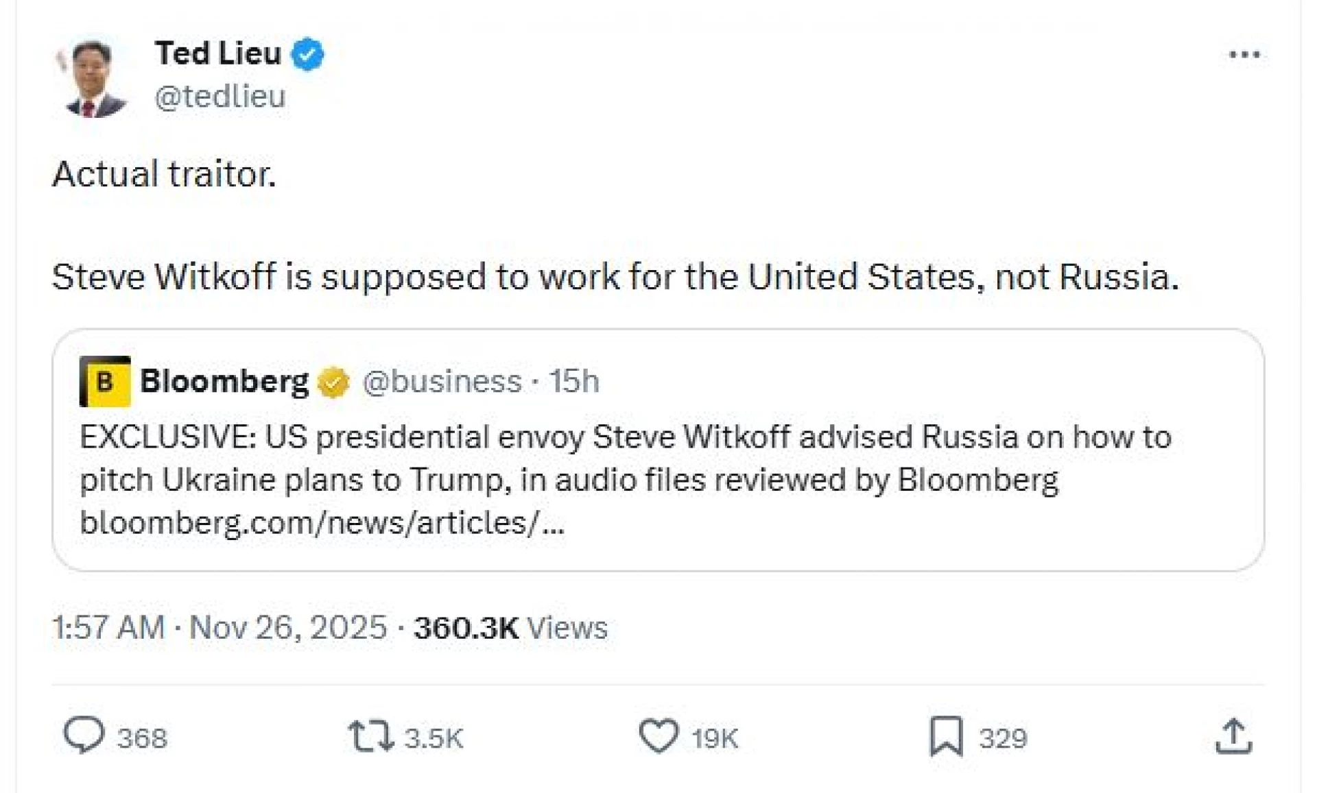 Член на Камарата на представителите на САЩ, демократът Тед Лиу, коментира изтеклите разговори между специалния представител на Белия дом Стив Уиткоф и пратеника на Кремъл Кирил Дмитриев, като определи действията на Уиткоф като "предателство".