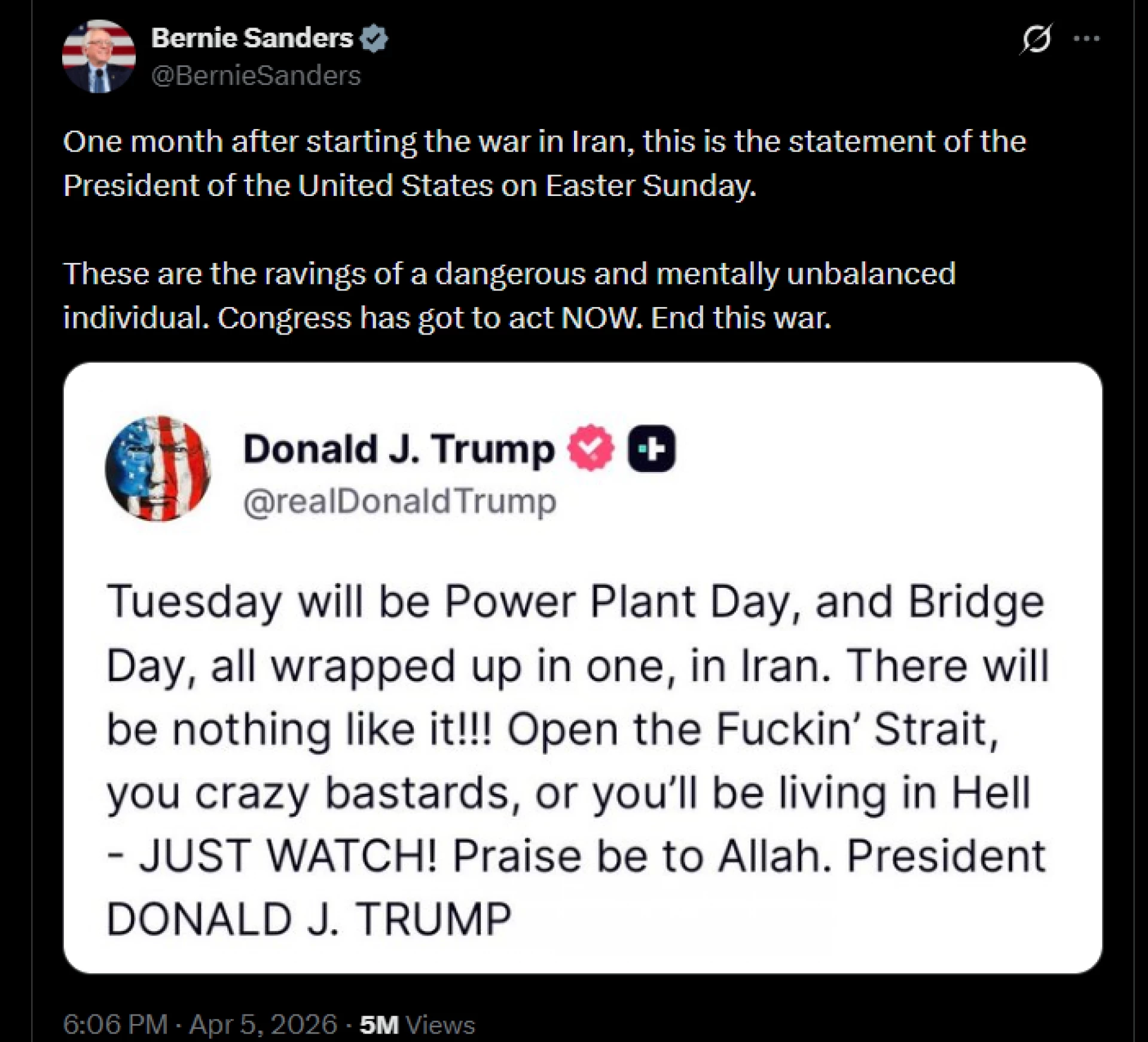"Един месец след началото на войната в Иран, това е изявлението на президента на Съединените щати на Великден. Това са бръщолевенията на един опасен и психически неуравновесен човек. Конгресът трябва да действа СЕГА. Спрете тази война", написа Сандърс.