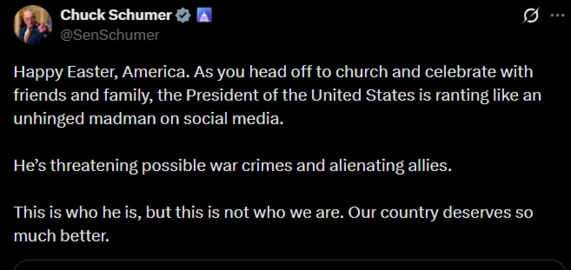 "Честит Великден, Америка. Докато отивате на църква и празнувате с приятели и семейство, президентът на Съединените щати беснее като луд в социалните мрежи. Той заплашва с евентуални военни престъпления и отблъсква съюзниците си.