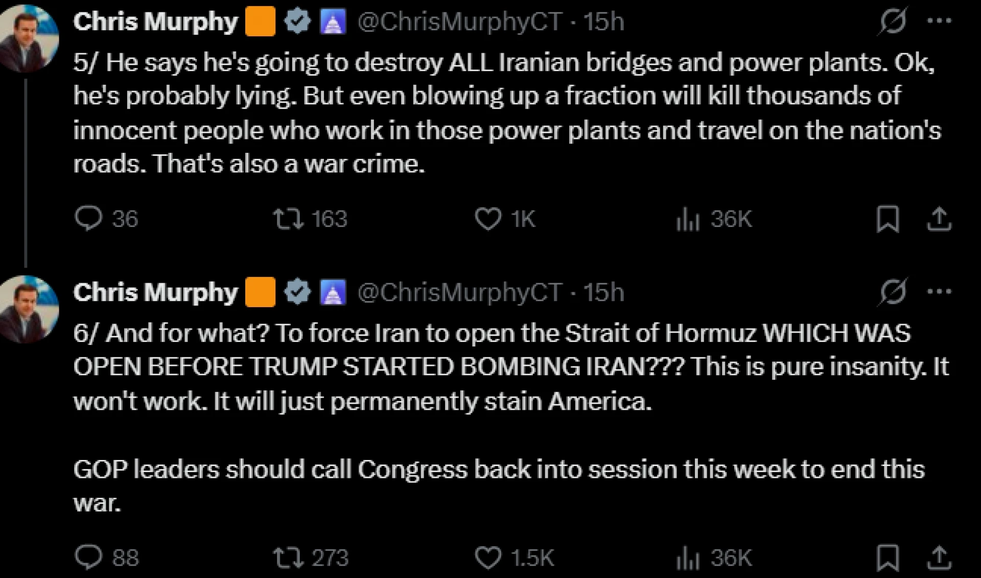 "Той казва, че ще разруши ВСИЧКИ ирански мостове и електроцентрали. Добре, вероятно лъже. Но дори взривяването на малка част от тях ще убие хиляди невинни хора, които работят в тези електроцентрали и пътуват по пътищата на страната. Това също е военно престъпление.