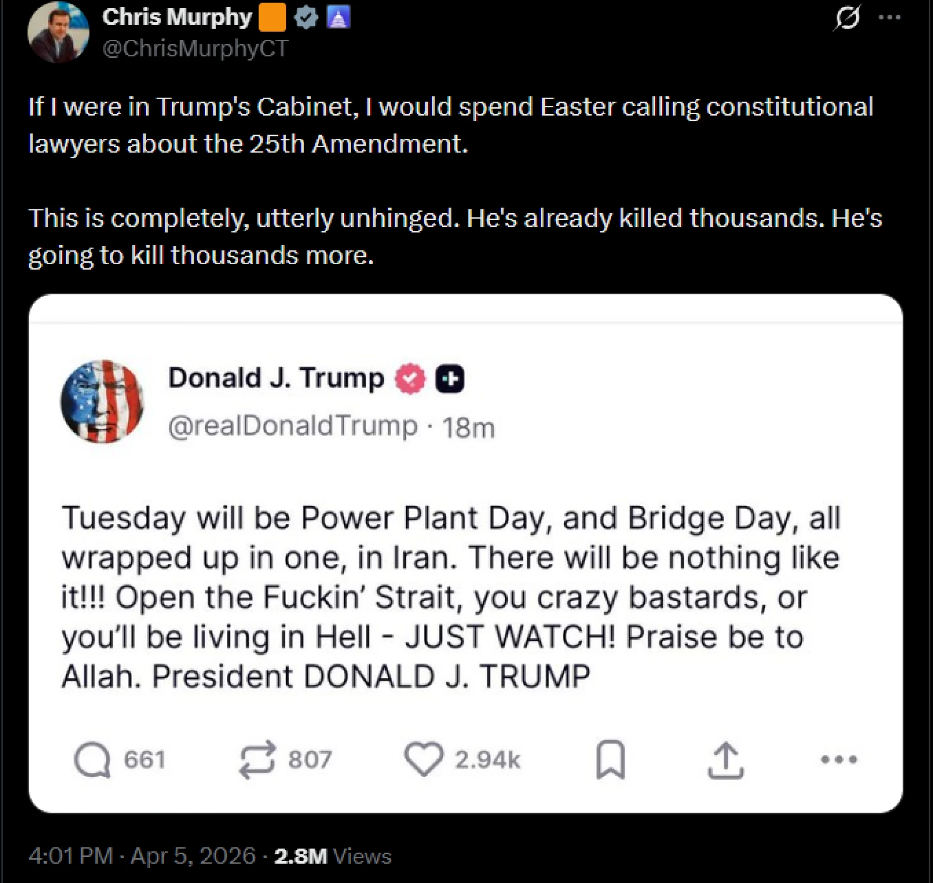 "Ако бях в Овалния кабинет днес, нямаше да празнувам Великден. Щях да седя с конституционни адвокати и да обсъждам 25-та поправка. Това е съвършено, абсолютно откачено. Той вече е убил хиляди. Ще убие още хиляди."