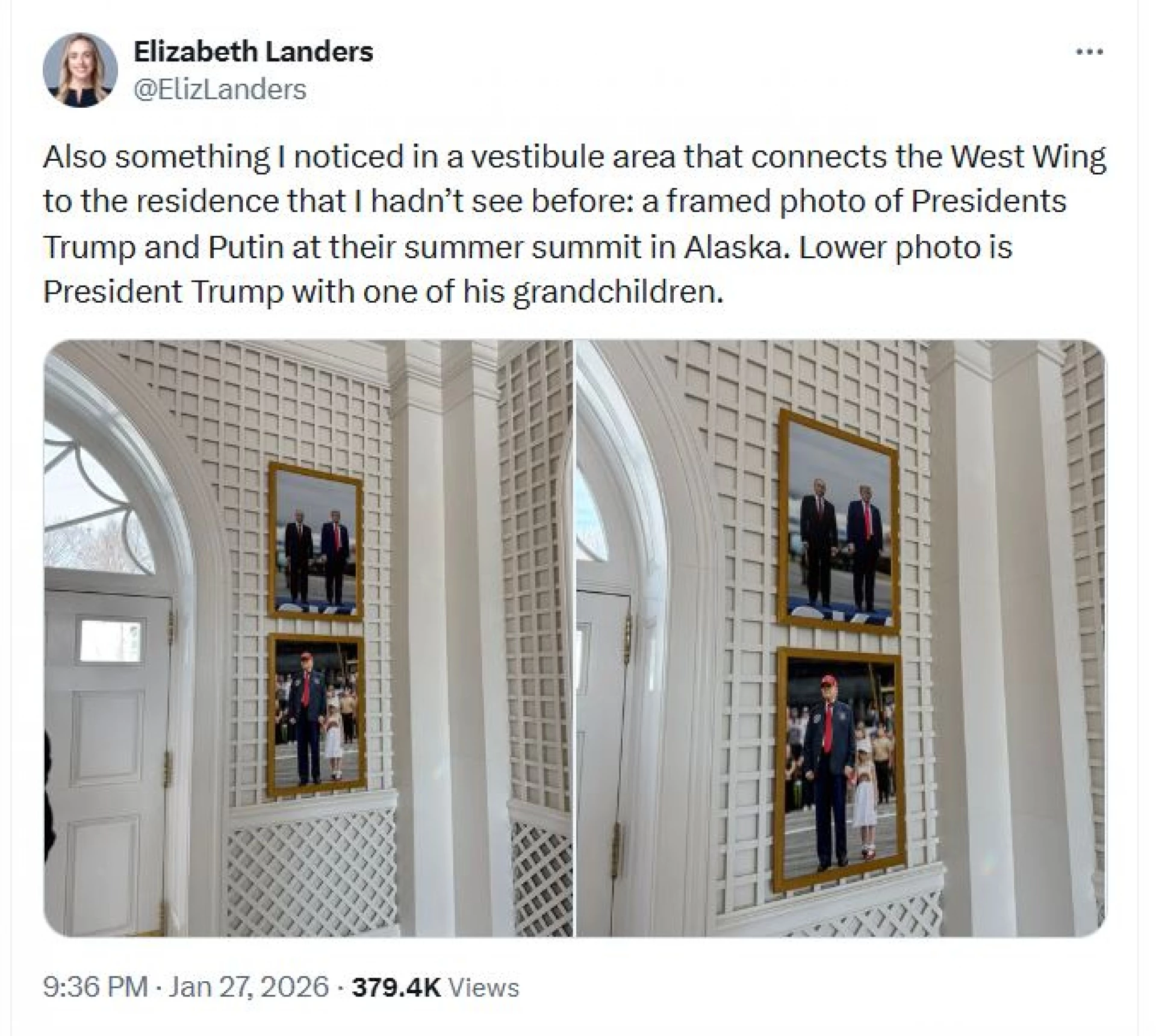 Американският президент Доналд Тръмп е окачил във фоайето на Белия дом, свързващо западното крило с неговата резиденция, своя съвместна снимка с Владимир Путин. На това обърна внимание журналистката на PBS News Елизабет Ландърс, която публикува снимката в своя профил в социалната мрежа Х.