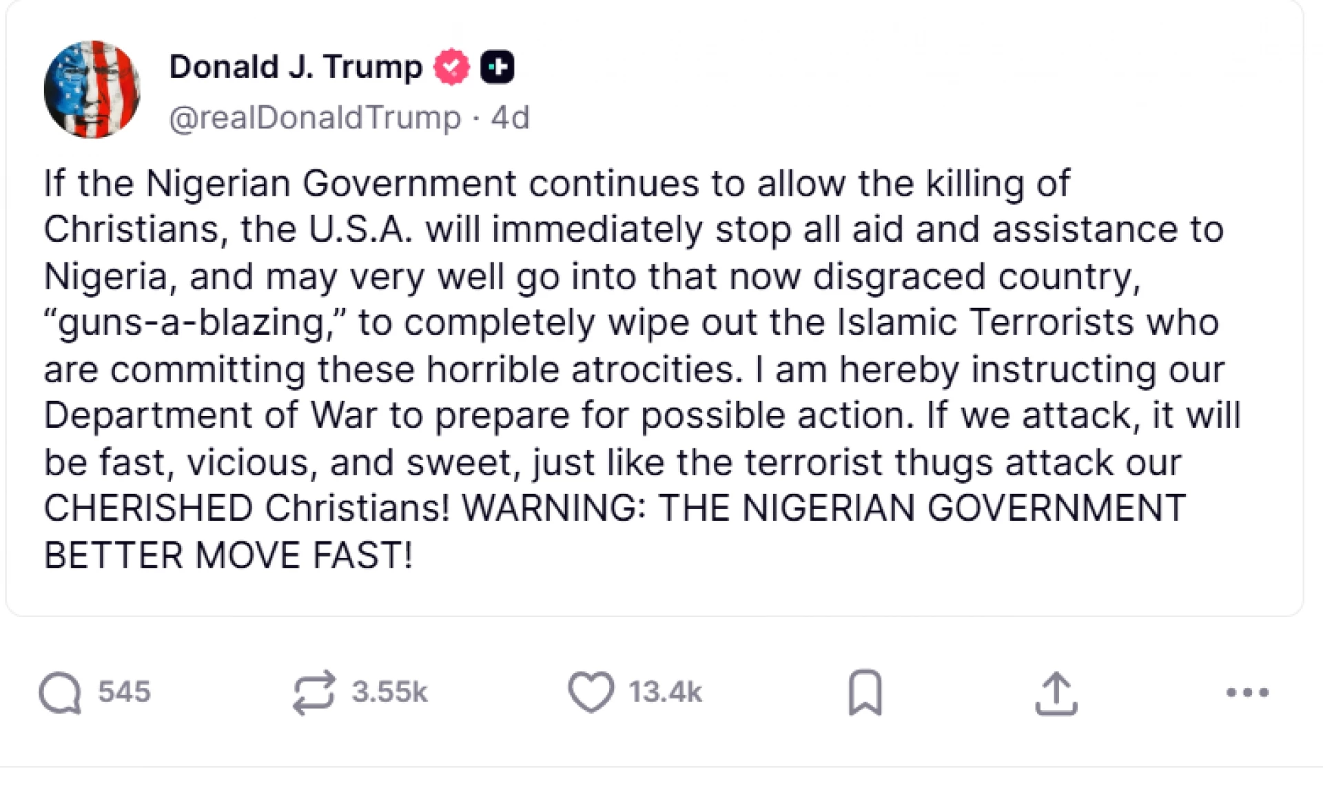 Още в събота Тръмп обяви в социалната си мрежа Truth Social, че е наредил на Пентагона да започне планиране на потенциални военни действия в Нигерия, като засили критиките си, че правителството не успява да обуздае преследването на християни в западноафриканската страна.