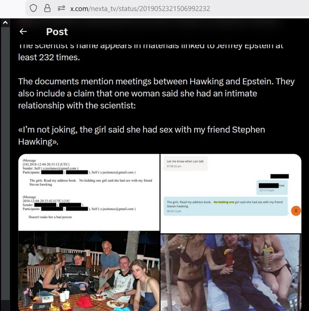 Сега, новите документи от американското правосъдно министерство сочат, че Хокинг може и да се е "забавлявал сексуално" с осигурена от Епстийн жена. Твърдението е на трети човек, който пише електронно съобщение до Епстийн - дали е вярно тепърва трябва да бъде доказвано. Само твърдение гласи, че едно момиче казало, че правило секс с Хокинг.