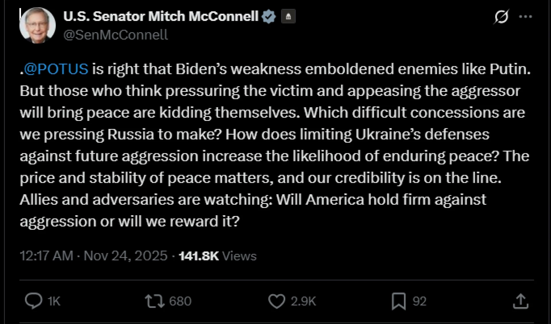 "Тези, които си мислят, че оказването на натиск върху жертвата и умилостивяването на агресора ще донесе мир, се заблуждават", написа остро в социалната мрежа Х Мич Макконъл. И предупреди, че авторитетът на САЩ е поставен на карта: "Съюзници и противници ни наблюдават: Ще се противопостави ли Америка на агресията или ще я възнаградим?"