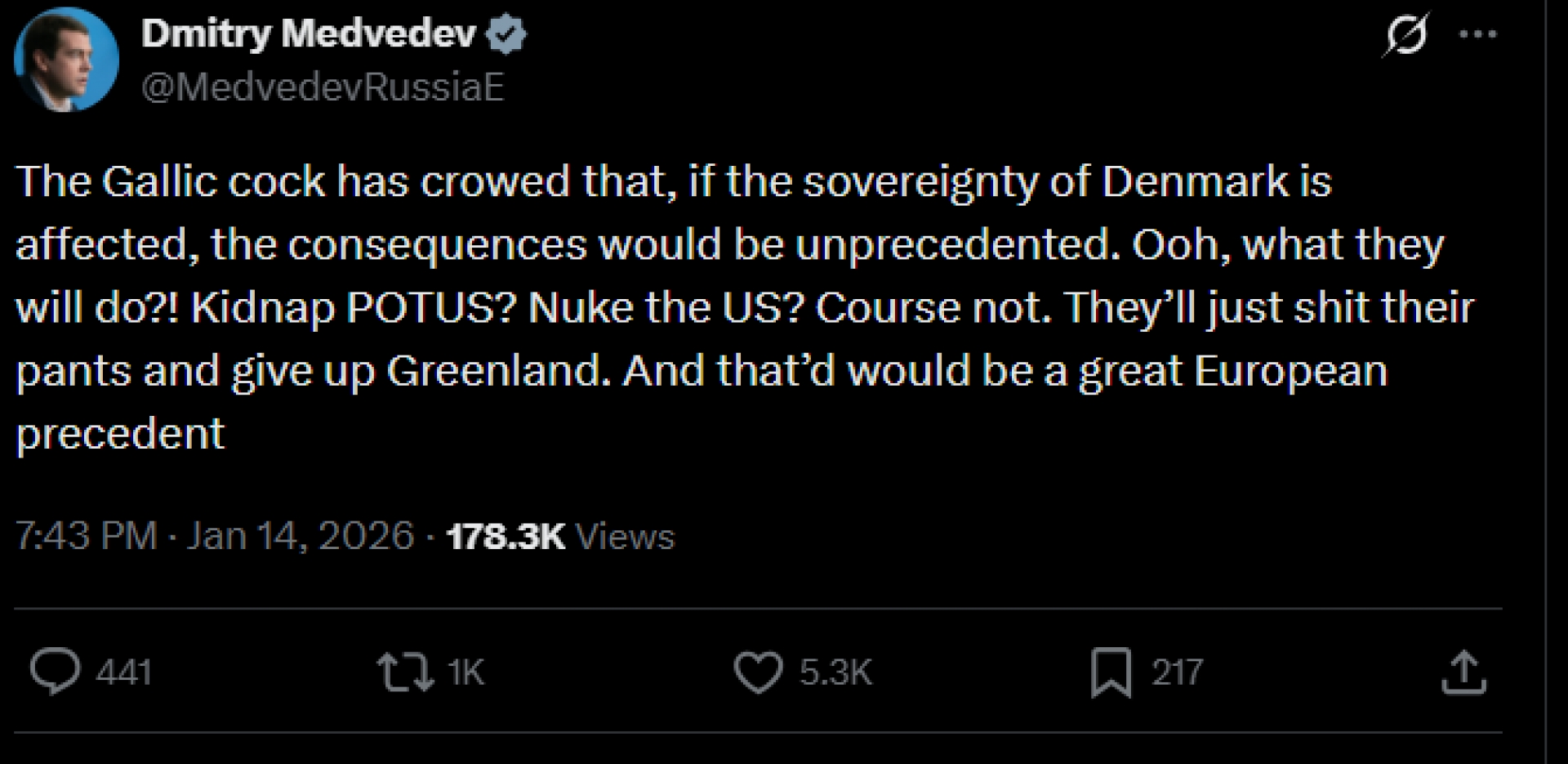 Междувременно вездесъщият Дмитрий Медведев, бивш президент и премиер, а понастоящем заместник-председател на Съвета на Русия, побърза отново да се изкаже като попита в Х какво изобщо би могла да направи Дания, за да защити острова от САЩ.