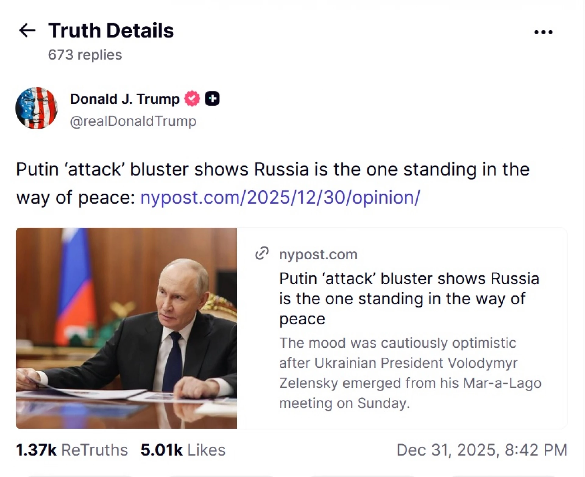 "Гръмко обявената атака (срещу резиденцията му в Новгородска област) показа, че именно Русия стои на пътя на мира". Тази статия на любимия си вестник The New York Post публикува в профила си в своята социална мрежа американският президент Доналд Тръмп.