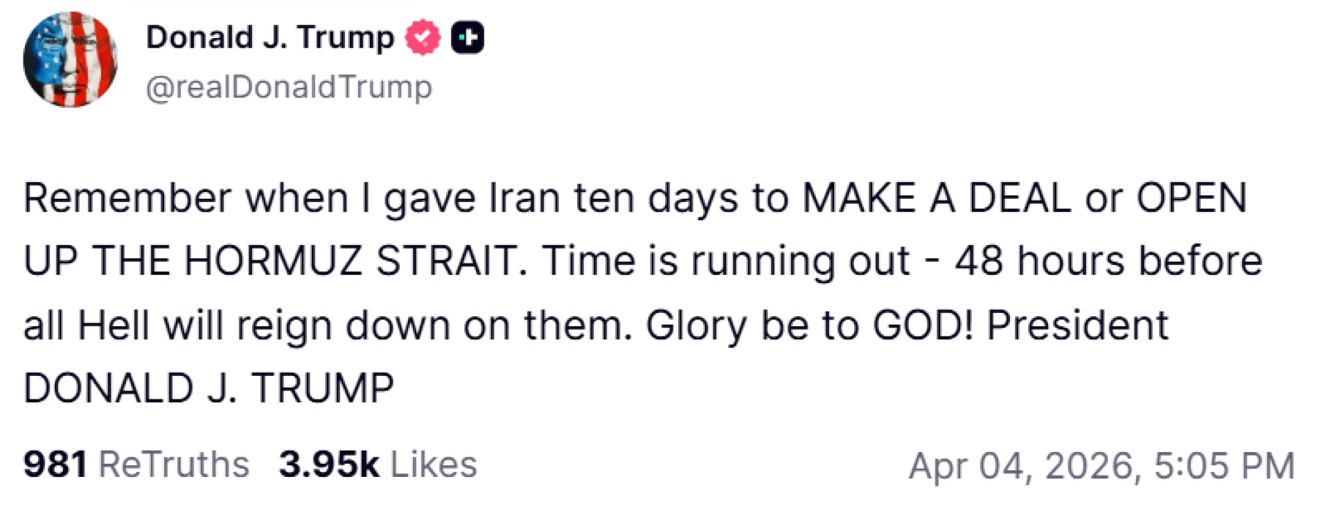 "Помните ли, когато дадох на Иран десет дни да СКЛЮЧИ СДЕЛКА или да ОТВОРИ ОРМУЗКИЯ ПРОЛИВ? Времето изтича - останаха 48 часа, преди целият Ад да се стовари върху тях. Слава на БОГ!", гласи постът на американския президент.