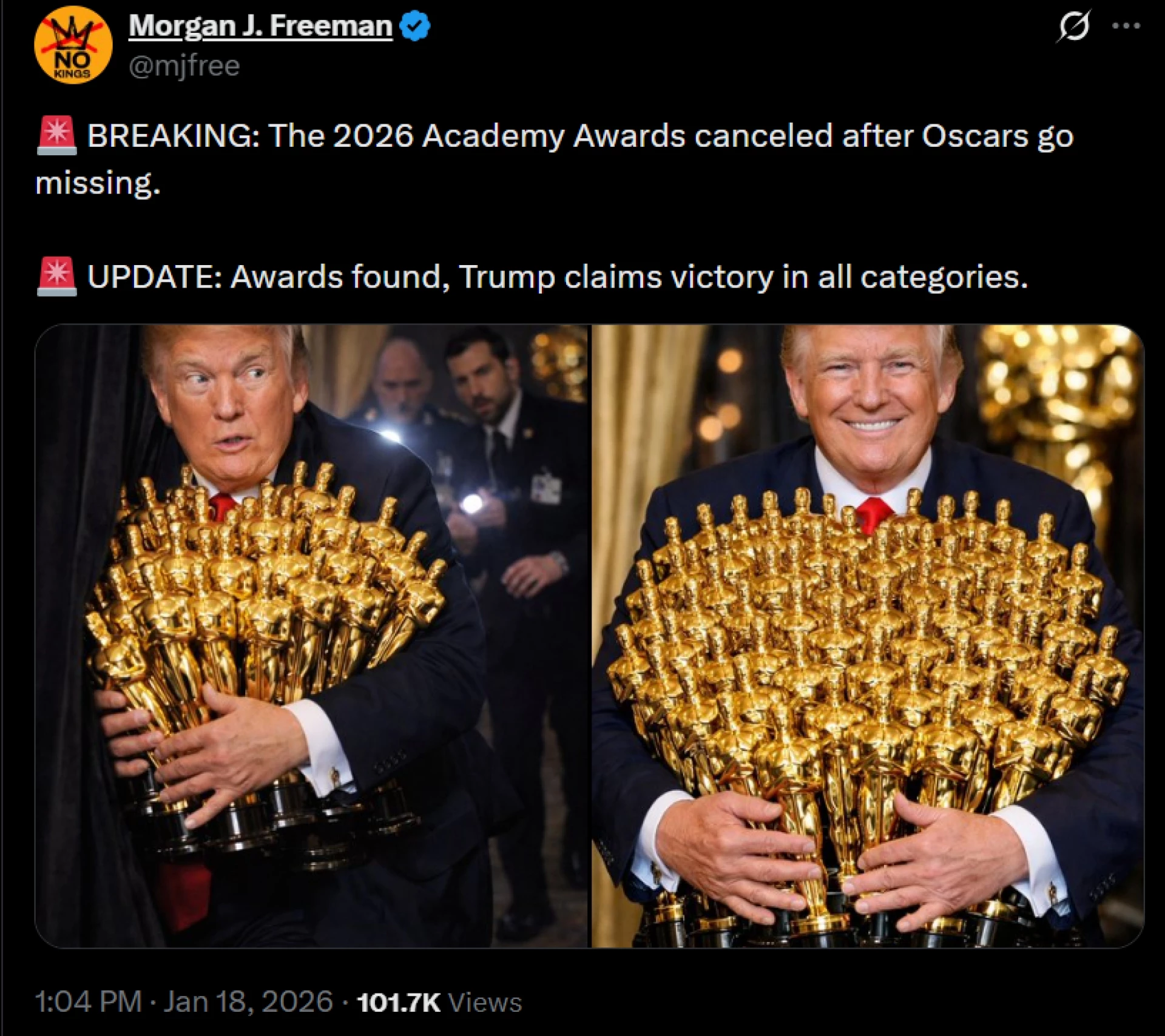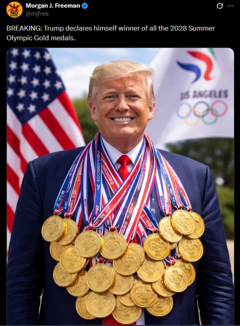 Актьорът и режисьор Морган Фрийман също се включи от официалния си профил в Х, за да обяви, че всички златни медали от Летните олимпийски игри през 2028, дори преди да са се провели, получава Тръмп, както и всички Оскар-и за 2026 г.