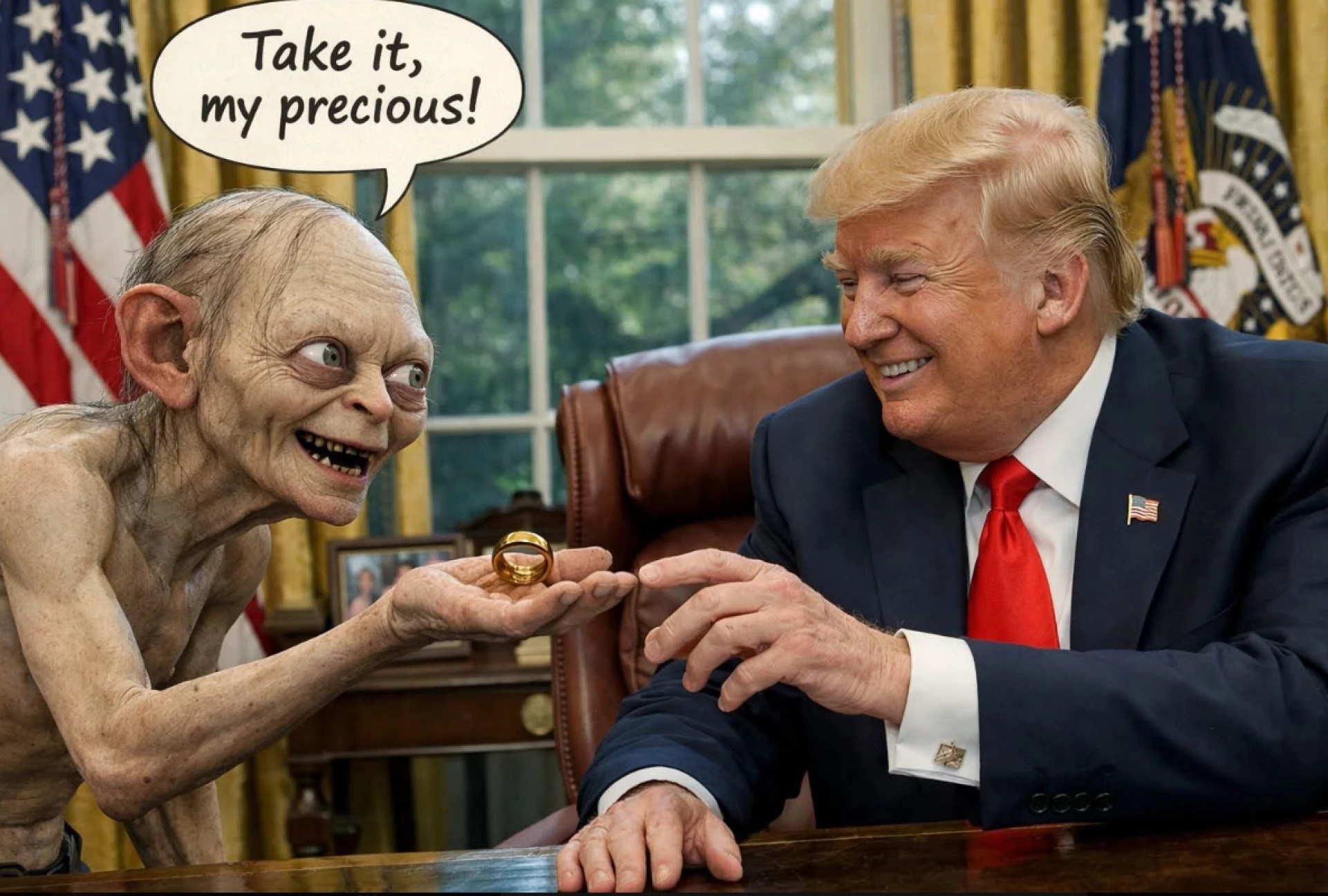Хари Потър, Индиана Джоунс, Ам-Гъл и Снежанка - всички му дават най-свидното си, дори бог Тор се разделя с най-могъщото оръжие в Деветте свята, чукът Мьолнир, та дано Тръмп по-дълго се заглавичква и отклони поглед от Гренландия и други части на Земното кълбо, накъдето... Но нека просто да разгледаме наградите му: