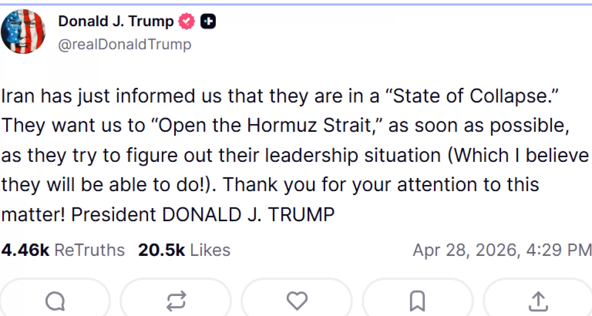 "Иран току-що ни информира, че е "в състояние на колапс". Това написа преди минути американският президент Доналд Тръмп в социалната си мрежа Truth Social.