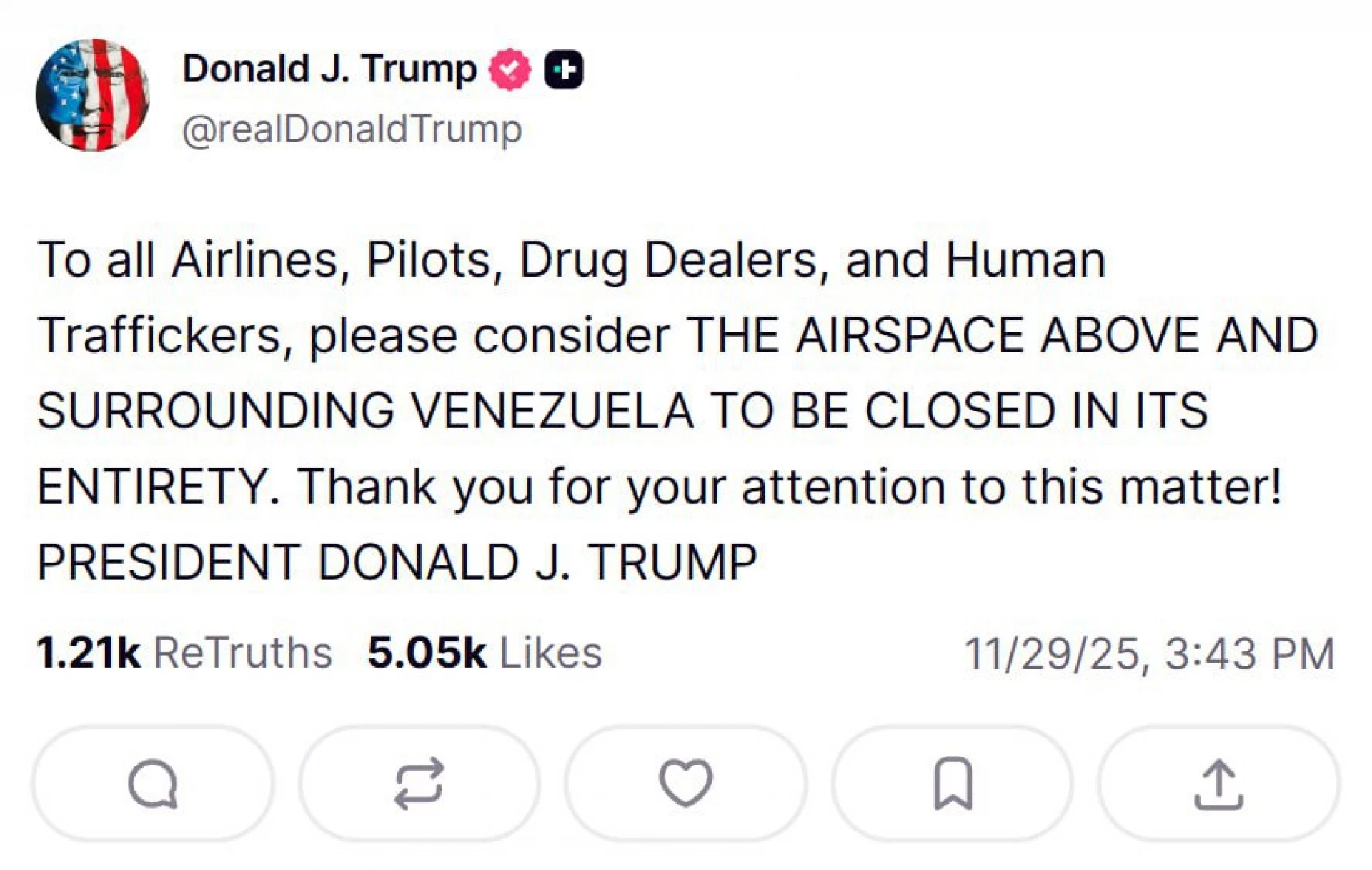 "Към всички авиолинии, пилоти, наркодилъри и трафиканти на хора – моля да имате предвид, че въздушното пространство над и около Венецуела ще бъде затворено в своята цялост." Това написа днес американският президент Доналд Тръмп в своята социална мрежа "Трут Соушъл".