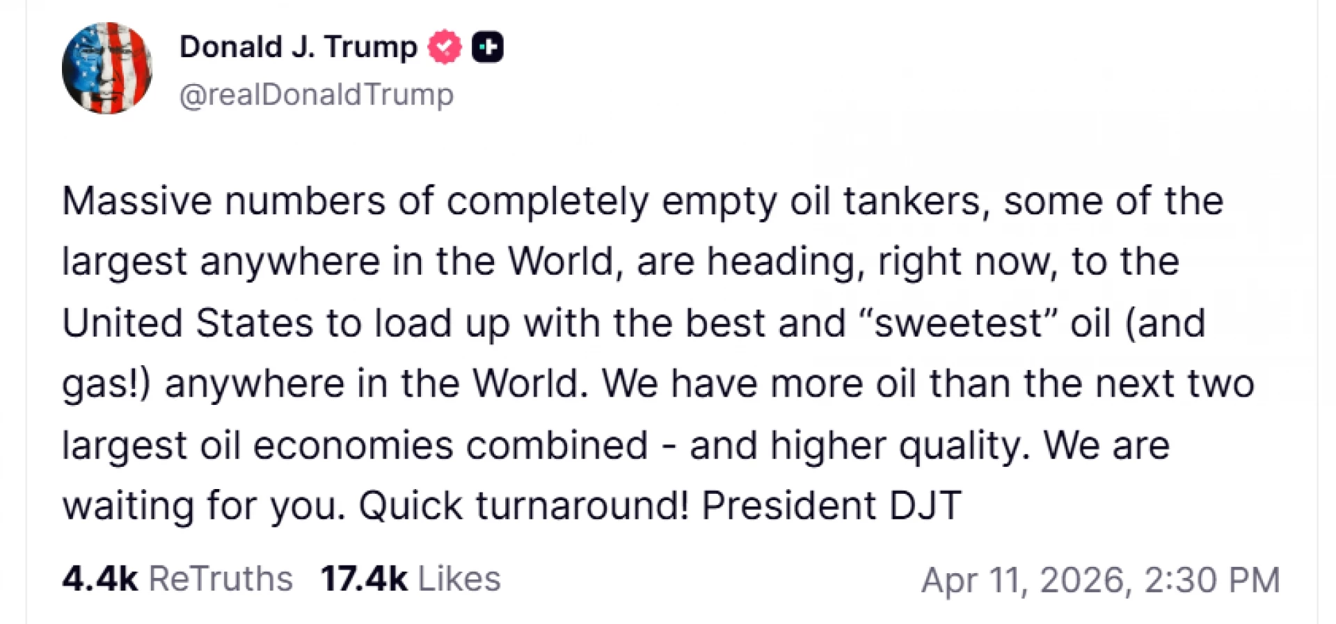 "Огромен брой напълно празни петролни танкери, едни от най-големите в света, в момента се насочват към САЩ, за да се заредят с най-добрия и най-сладък петрол (и газ) в света. Имаме повече петрол от следващите две най-големи петролни икономики взети заедно - и с по-високо качество. Очакваме ви. Бързо изпълнение [на поръчките]!"
