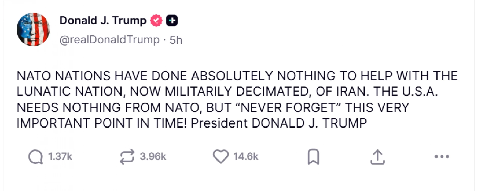 "Страните членки от НАТО не направиха абсолютно нищо, за да помогнат за справянето с тази държава на душевноболни и вече лишена от военни активи, която се нарича Иран", написа тази сутрин Тръмп в социалната си мрежа "Трут Соушъл". "САЩ НЕ СЕ НУЖДАЕ ОТ НИЩО ОТ НАТО, НО "НИКОГА НЕ ЗАБРАВЯЙТЕ" ТОЗИ МНОГО ВАЖЕН МОМЕНТ ВЪВ ВРЕМЕТО!", гласи публикацията на Тръмп.