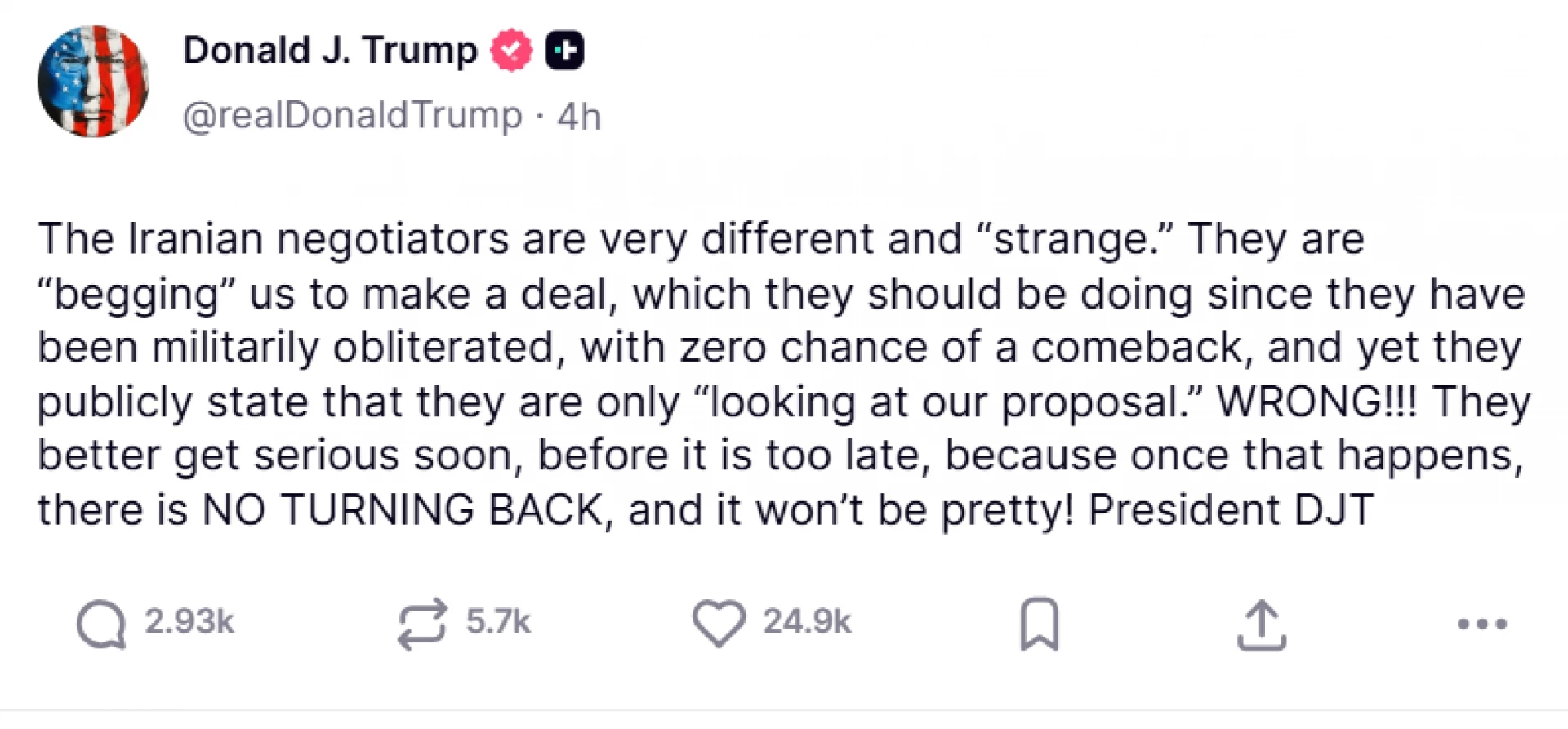 "По-добре да се отнесат сериозно, преди да е твърде късно, защото когато това стане, НЯМА ДА ИМА ВРЪЩАНЕ НАЗАД и няма да е красиво," заяви Тръмп в друг пост в социалната си мрежа.