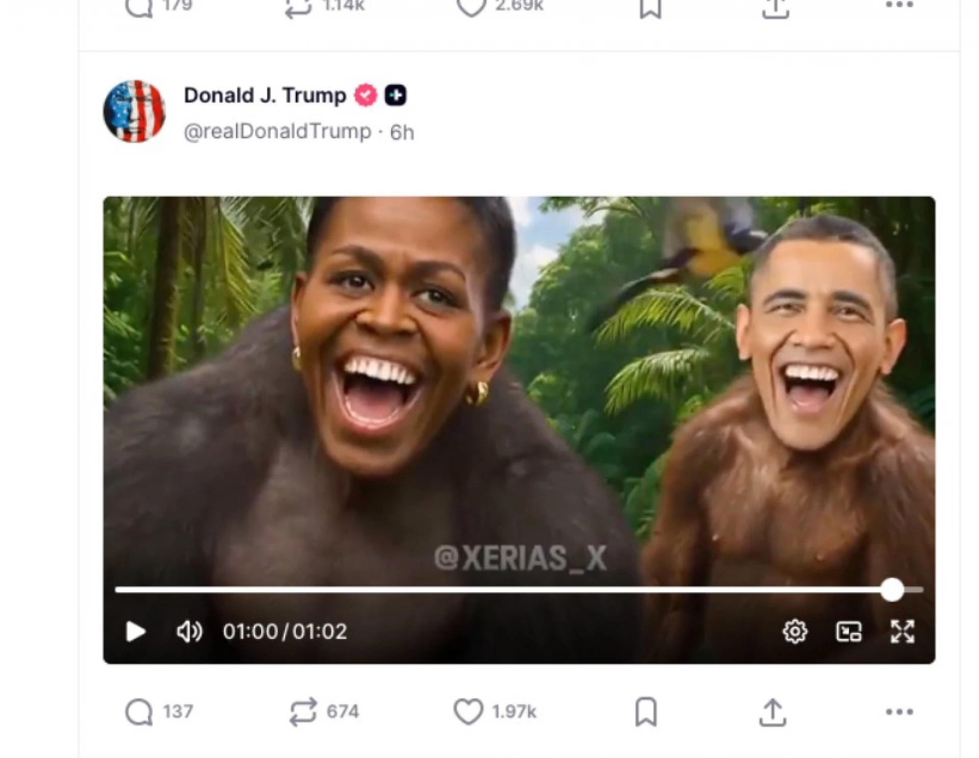 В четвъртък президентът от Републиканската партия публикува едноминутно видео, подсилващо неговите фалшиви твърдения, че поражението му на изборите през 2020 г. е резултат от измама. На танцуващи примати, очевидно генерирани от изкуствен интелект, са наложени главите на бившия президент демократ Барак Обама и съпругата му Мишел. Видеото бе свалено около 12 часа по-късно, а говорителката на Белия дом Карълайн Левит заяви, че публикацията е породила "фалшиво възмущение".