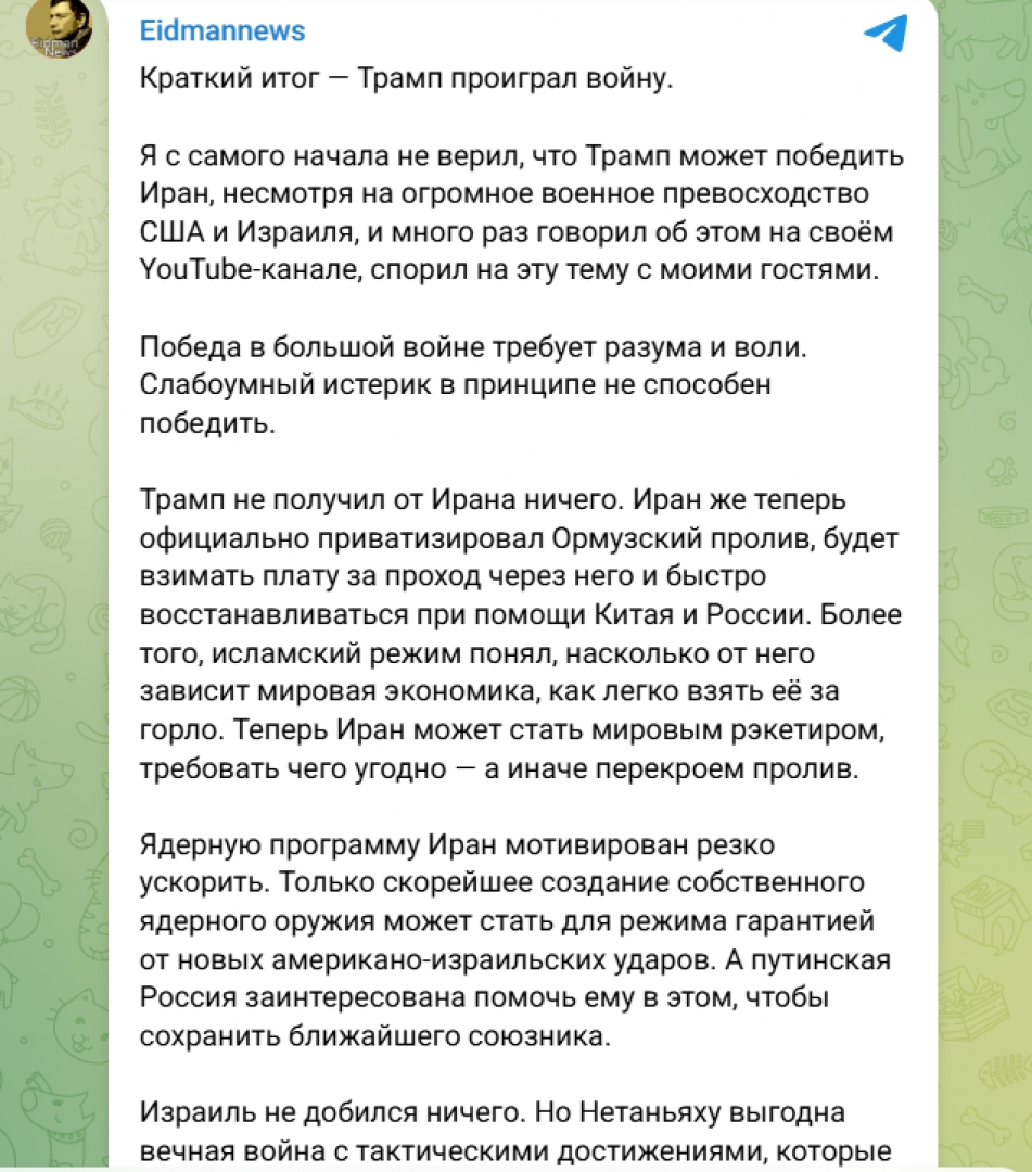 Американският президент Доналд Тръмп показа, че не може да победи Иран, въпреки огромното военно превъзходство на САЩ и Израел. Победата в една голяма война изисква интелигентност и воля. Слабоумният истерик е неспособен на победа. Това са думи на руския социолог Игор Ейдман в телеграм канала му. Ето какво още пише той: