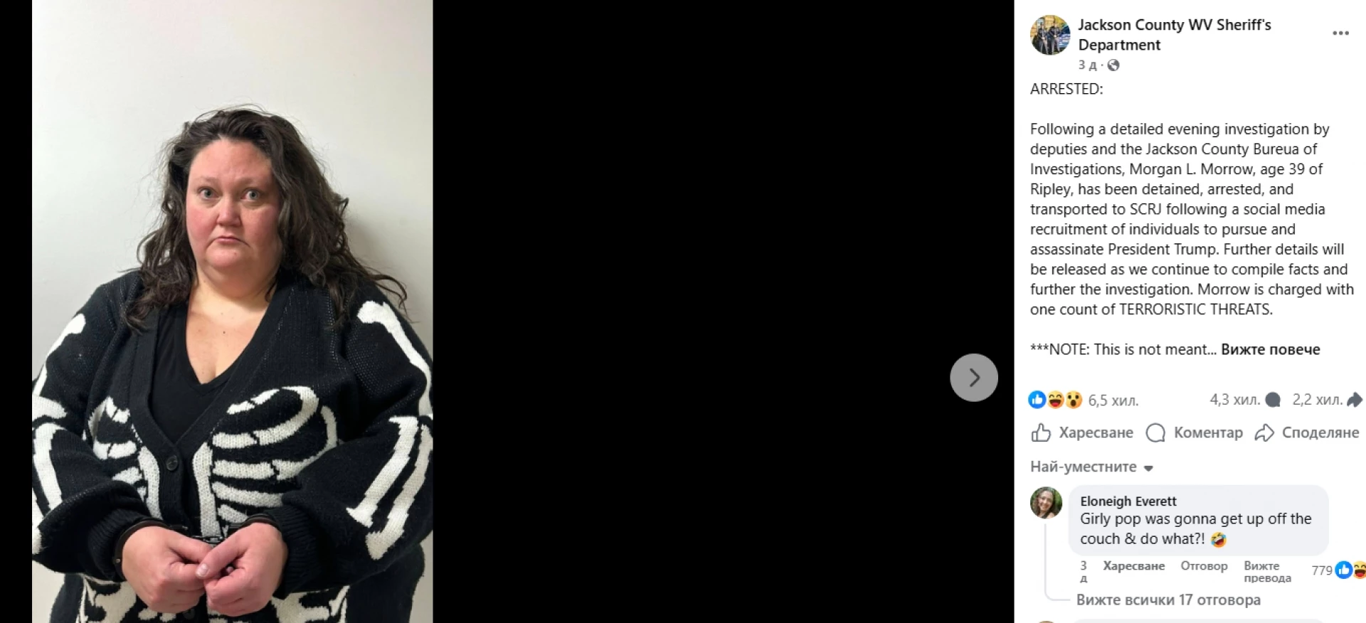 Според публикацията Морган Лий Мороу от Рипли е била задържана "във връзка с вербуването ѝ в социалните медии от лица за преследване и убийство на президента Тръмп". Тя има обвинение и за "отправяне на терористични заплахи", се казва в съобщението.