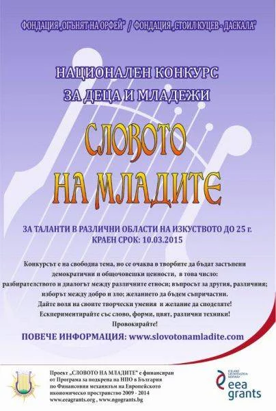 Фондация „Огънят на Орфей” и фондация „Стоил Куцев-Даскала” обявяват национален конкурс „Словото на младите” за таланти в различни области на изкуството. Той е част от проекта „Словото на младите”, финансиран чрез безвъзмездна помощ от програма за подкрепа на НПО в България по финансовия механизъм на ЕИП (Норвегия, Исландия, Лихтенщайн) 2009-2014.