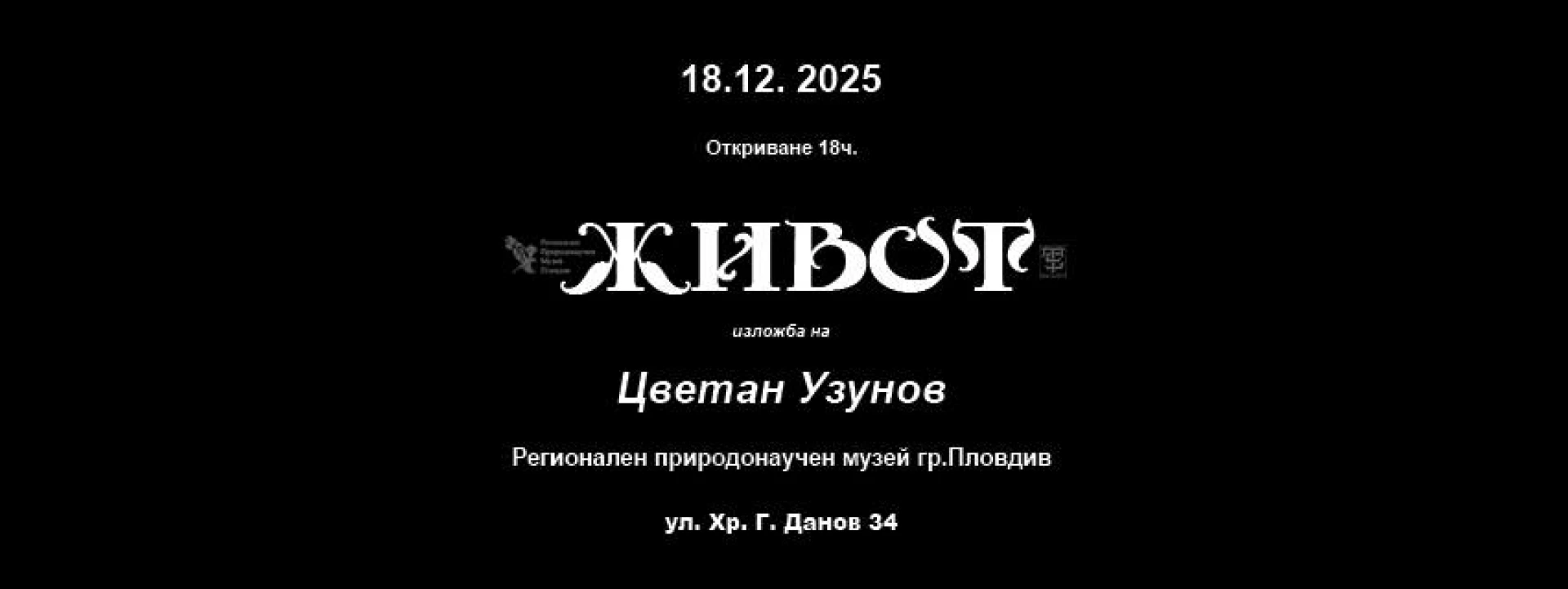 Пловдивският артист Цветан Узунов - TSE ще открие изложба на 18 декември в Регионалния природонаучен музей – Пловдив, съобщават от институцията в града. По думите им "Живот" не е просто експозиция на картини, а емоционален разказ за движението и силата на природата. В своите монохромни и цветни платна Узунов улавя онези мигове, в които животното спира да бъде просто образ и се превръща в символ на свободата. От графичния контраст на черното и бялото до експлозията от живи цветове, творбите създават мост между човека и дивия свят – връзка, която днес е по-крехка от всякога, посочват от музея.