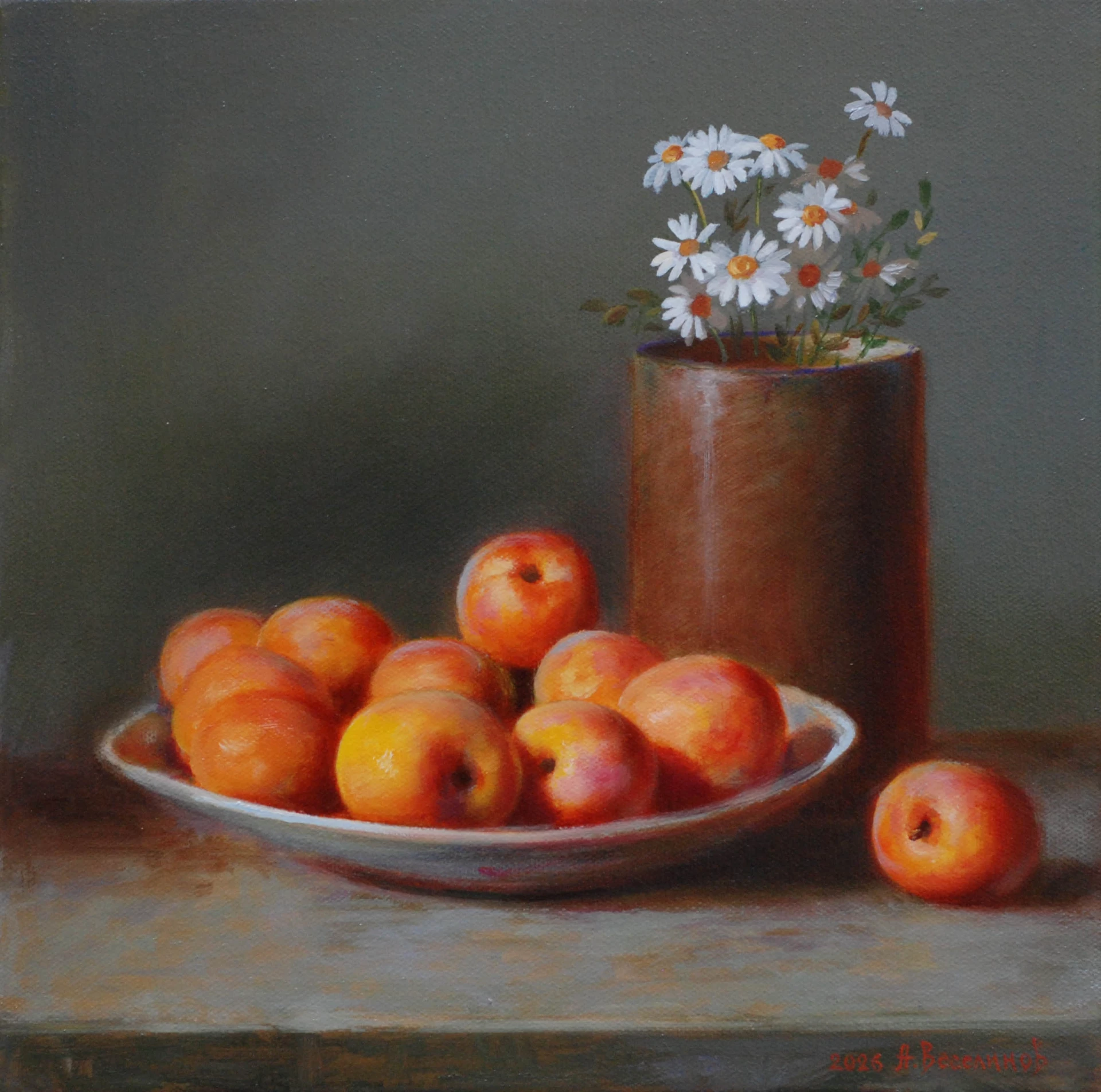 В изложбата ще видим, спечелилите му популярност, сред ценителите, прекрасни натюрморти. Изпълнени с вещина, ползвайки технологията на старата класическа школа, той постига една особена магия в отблясъка на порцелана или пречупването на изображението през овала на стъклената ваза; във восъчната крехкост на всяко листенце и на всяко цветче; в мъха по повърхността на узрелите праскови; в сладостта на смокините, прозираща през презрелите, леко напукани кожици…Така наречената мъртва натура – натюрморт, в платната на Ангел Веселинов оживява. Тя придобива плътност, аромат, движение на светлината и предизвиква истинско усещане за дом, за уют, за конкретен сезон, за празник…