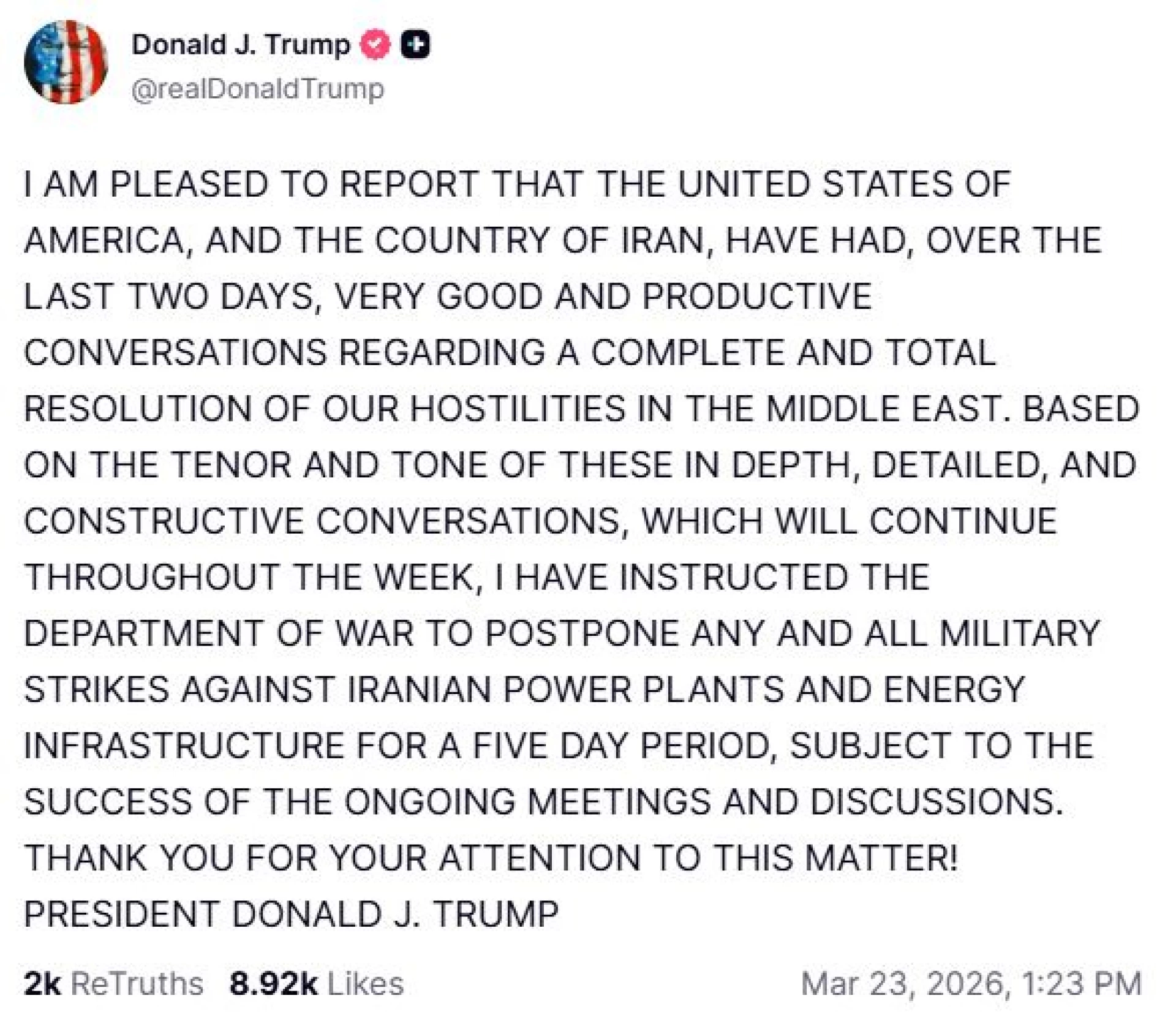 "С удоволствие съобщавам, че Съединените американски щати и Иран проведоха през последните два дни много добри и продуктивни разговори относно пълното и цялостно разрешаване на нашите враждебни действия в Близкия изток. Въз основа на характера и тона на тези задълбочени, подробни и конструктивни разговори, които ще продължат през цялата седмица, инструктирах Министерството на отбраната да отложи всички военни удари срещу иранските електроцентрали и енергийна инфраструктура за период от пет дни, в зависимост от успеха на текущите срещи и дискусии. Благодаря ви за вниманието по този въпрос!"