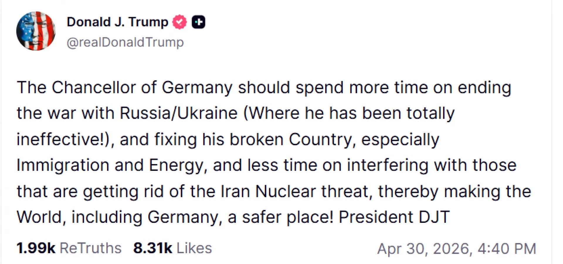 „Канцлерът на Германия трябва да отделя повече време за прекратяването на войната между Русия и Украйна (в което досега е напълно неефективен!) и на поправянето на разбитата си страна, особено по отношение на имиграцията и енергетиката, и по-малко време да се меси в делата на тези, които се избавят от иранската ядрена заплаха, правейки по този начин света, включително и Германия, по-безопасно място!“, написа Тръмп в социалната си мрежа Трут Соушъл.