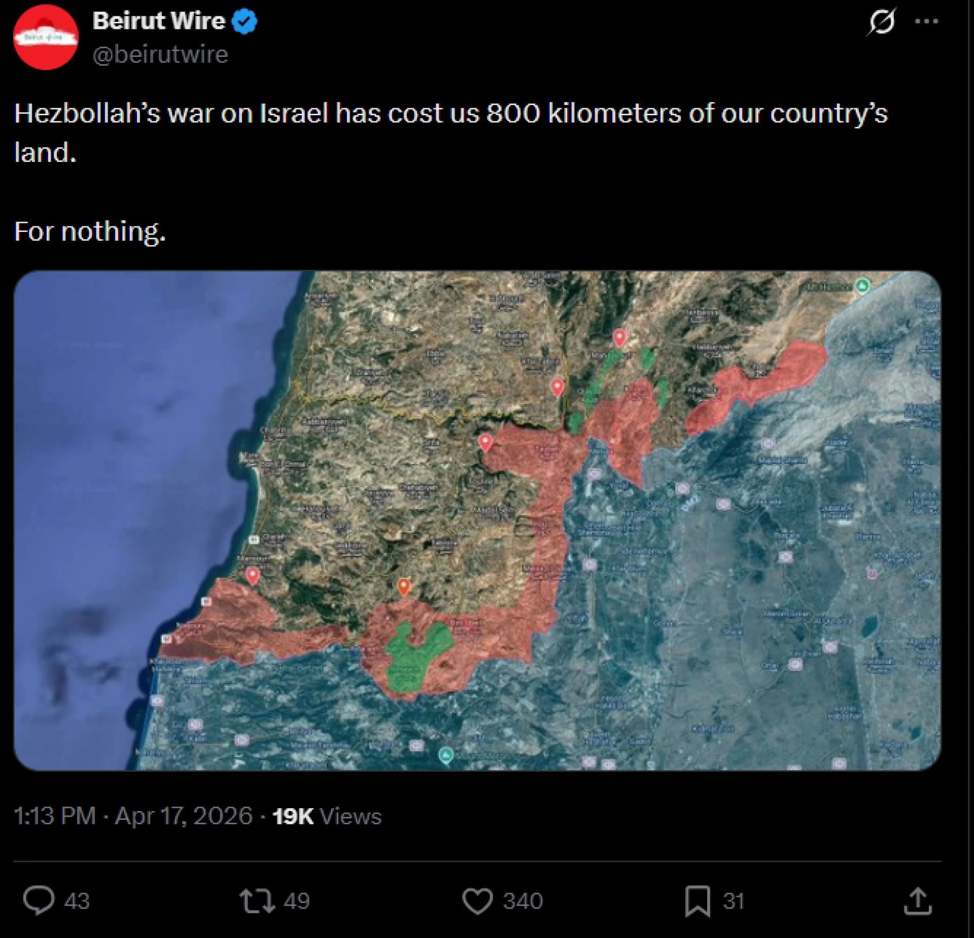 Ливанският информационен канал Beirut Wire обвини групировката "Хизбула", че с военните си действия срещу Израел е станала причина Ливан да загуби контрола върху 800 квадратни километра от своята територия.