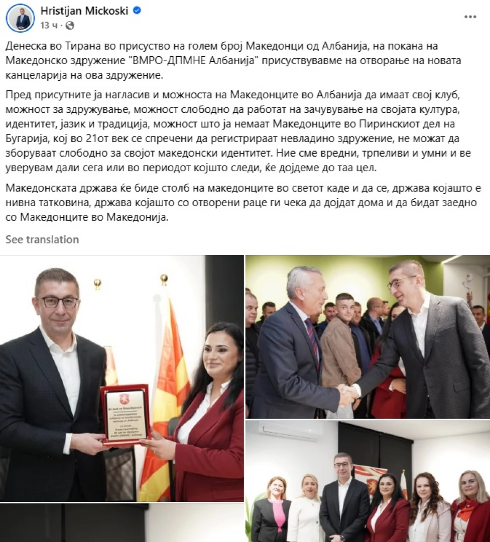 "Подчертах пред присъстващите възможността македонците в Албания да имат свой собствен клуб, възможност за сдружаване, възможност свободно да работят за запазване на своята култура, идентичност, език и традиция, възможност, която македонците в Пиринския регион на България нямат. Които през 21-ви век са възпрепятствани да регистрират неправителствено сдружение, не могат да говорят свободно за своята македонска идентичност. Ние сме трудолюбиви, търпеливи и умни и ви уверявам, че сега или в следващия период ще постигнем тази цел", написа Мицкоски в свой пост във Фейсбук.