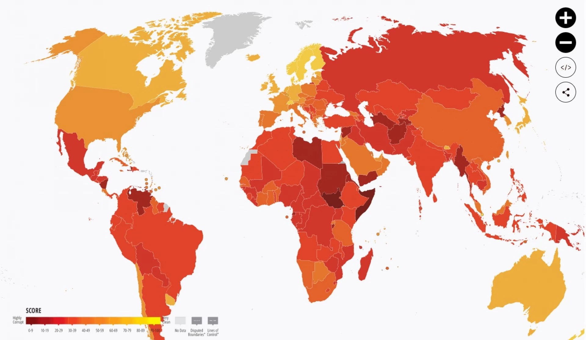 Класацията на „Трансперънси интернешънъл“ измерва възприятието за съществуваща корупция в публичния сектор в 182 държави и територии чрез обединяване на данни от 13 независими източника. Класацията се изготвя чрез присъждане на точки от 0 до 100, където 100 е „без корупция“.