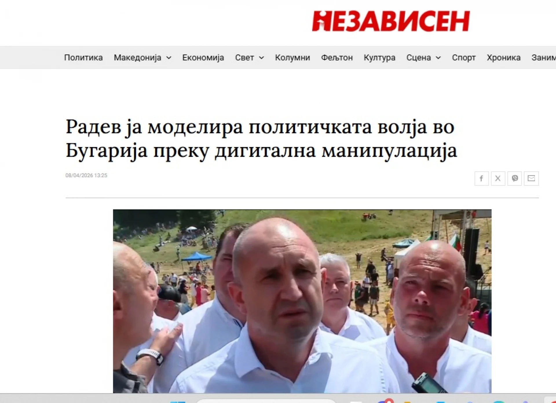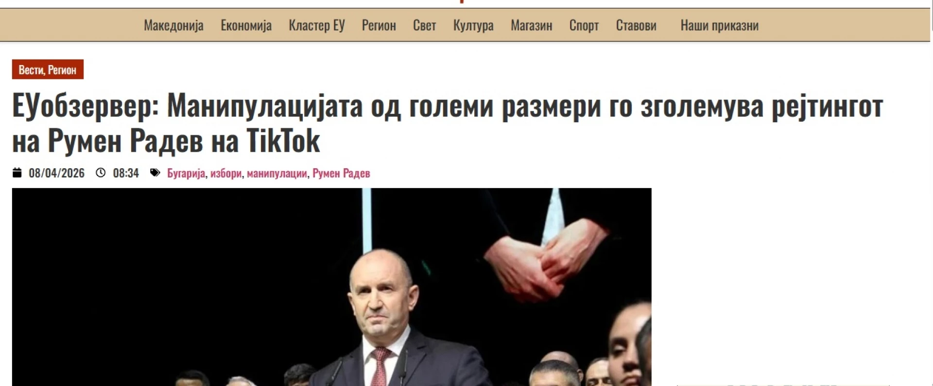 Широко цитиран в македонските медии е материалът на европейското онлайн издание EUobserver, което пише, че Румен Радев е натрупал 90 милиона гледания в TikTok чрез мрежи, чието поведение е трудно да се обясни с органична активност - т.е. това не е автентичен интерес и подкрепа за него, но е активност, която влияе на автентични хора. Докладът е намерил място в редица македонските медии, сред които "Независен", "Рацин", "Булевар". Констатациите на доклада са съсредоточени върху бившия президент Румен Радев, който води в социологическите проучвания и чиито позиции относно Русия и Украйна никога не са съвпадали напълно с европейския консенсус.