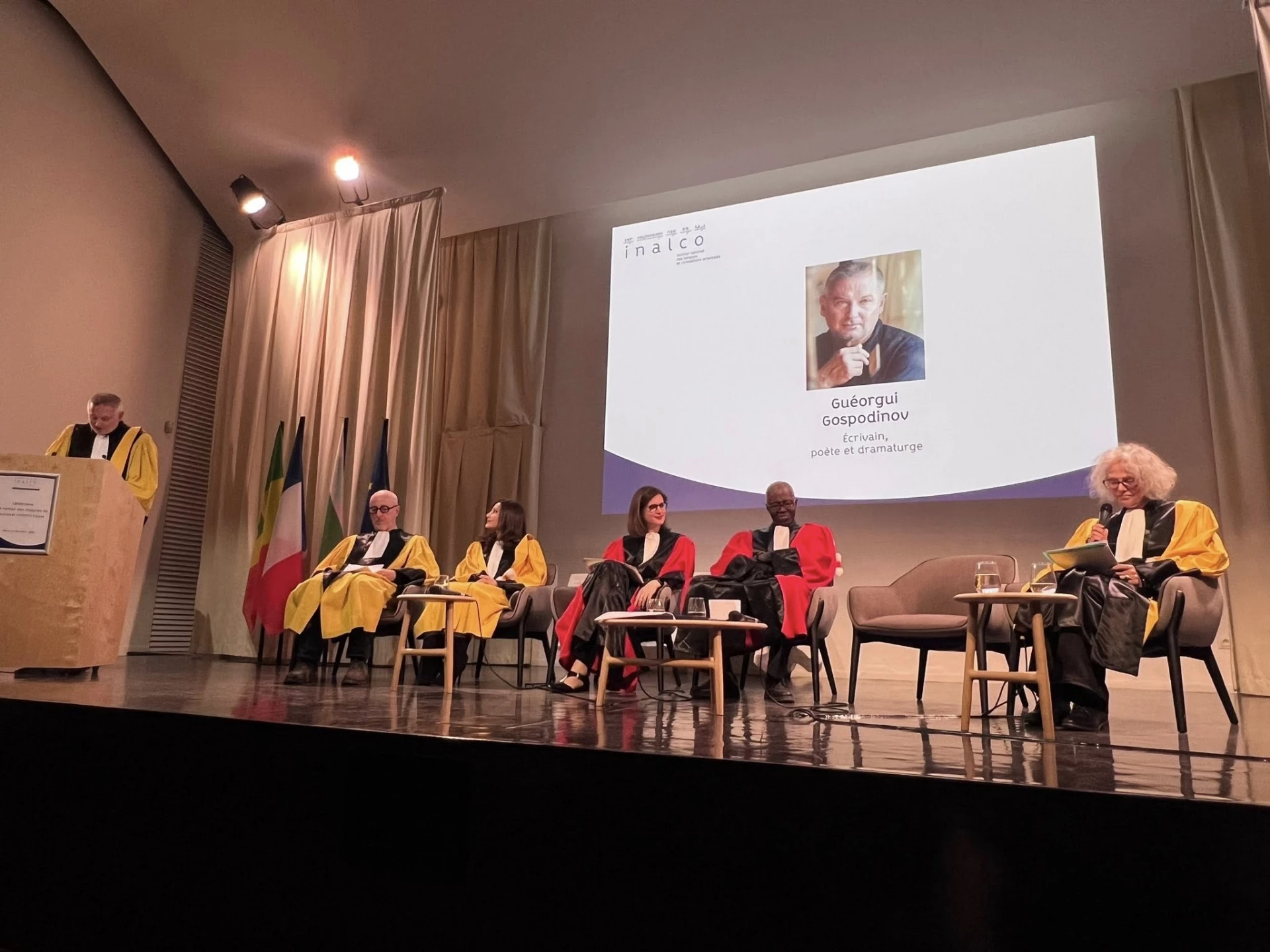 Писателят Георги Господинов е удостоен с титлата Доктор хонорис кауза на Националния институт за източни езици и цивилизации (INALCO) в Париж. Висшето учебно заведение, основано през 1669 г. (преди 357 години), е единствено по рода си в света с това, че предлага специализация по 104 езика от Централна и Източна Европа, Африка, Азия, Америка и Океания. Това го превръща в своеобразен хъб на многоезичието и многокултурието от всички континенти. Господинов е отличен за приноса си към европейската и световната литература. Церемонията се състоя на 30 март в сградата на INALCO в Париж.