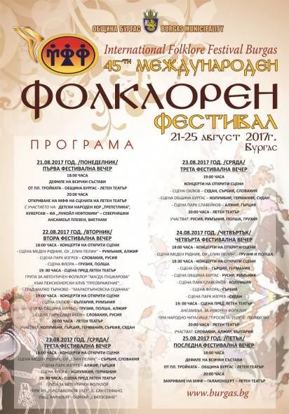 Такава е атмосферата само на Международния фолклорен фестивал в Бургас, който ще започне днес /21 август, понеделник/ от 18.00 часа с цветно и атрактивно шествие на всички гостуващи състави от общо 13 държави. По традиция то ще премине от площад "Тройката" до площад "Атанас Сиреков" /пред Община Бургас/ и до Летния театър.