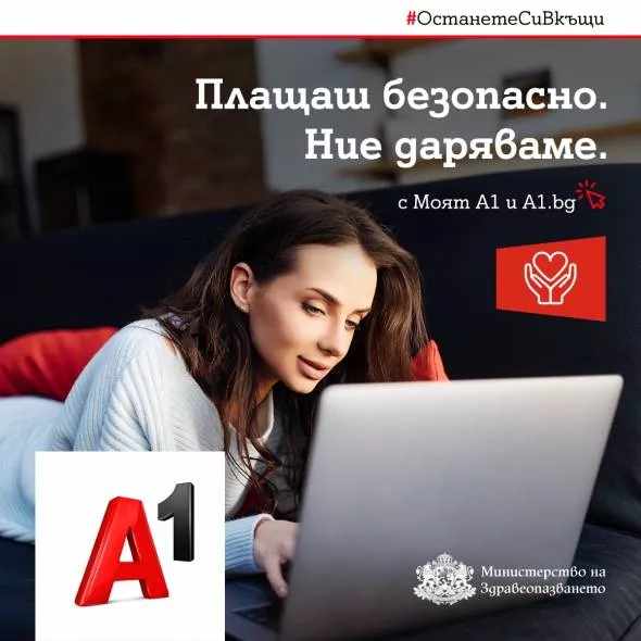 А1 ще дарява по 1 лев на дарителската сметка на Министерството на здравеопазването за всяка сметка, платена онлайн. В кампанията се включват плащането на сметка на всички видове услуги от А1 през мобилното приложение Моят А1 и уеб версията му на сайта на компанията. Инициативата е част от кампанията за дигитална солидарност на А1, която има за цел да помогне на потребителите да се справят в трудната ситуация и да ги насърчи да бъдат отговорни като си останат вкъщи и ползват дигитални канали за работа, учене, забавление и взаимодействие с компанията.