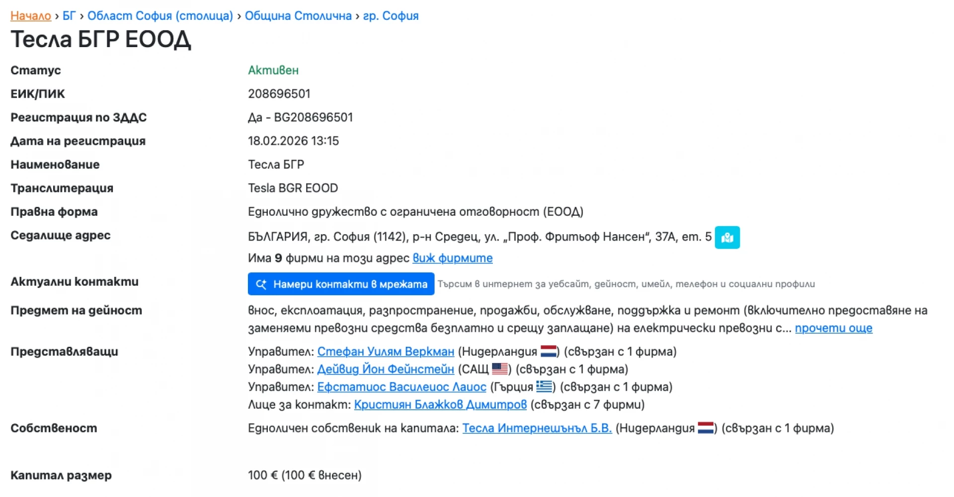 Промяната може да дойде чрез новорегистрираната компания "Тесла БГР" ЕООД, открита на 18 февруари тази година. Данните са засечени първоначално от Supercharged BG. Едноличен собственик на капитала е нидерландската Tesla International B.V. - ключовото звено, което управлява операциите на компанията в Европа.