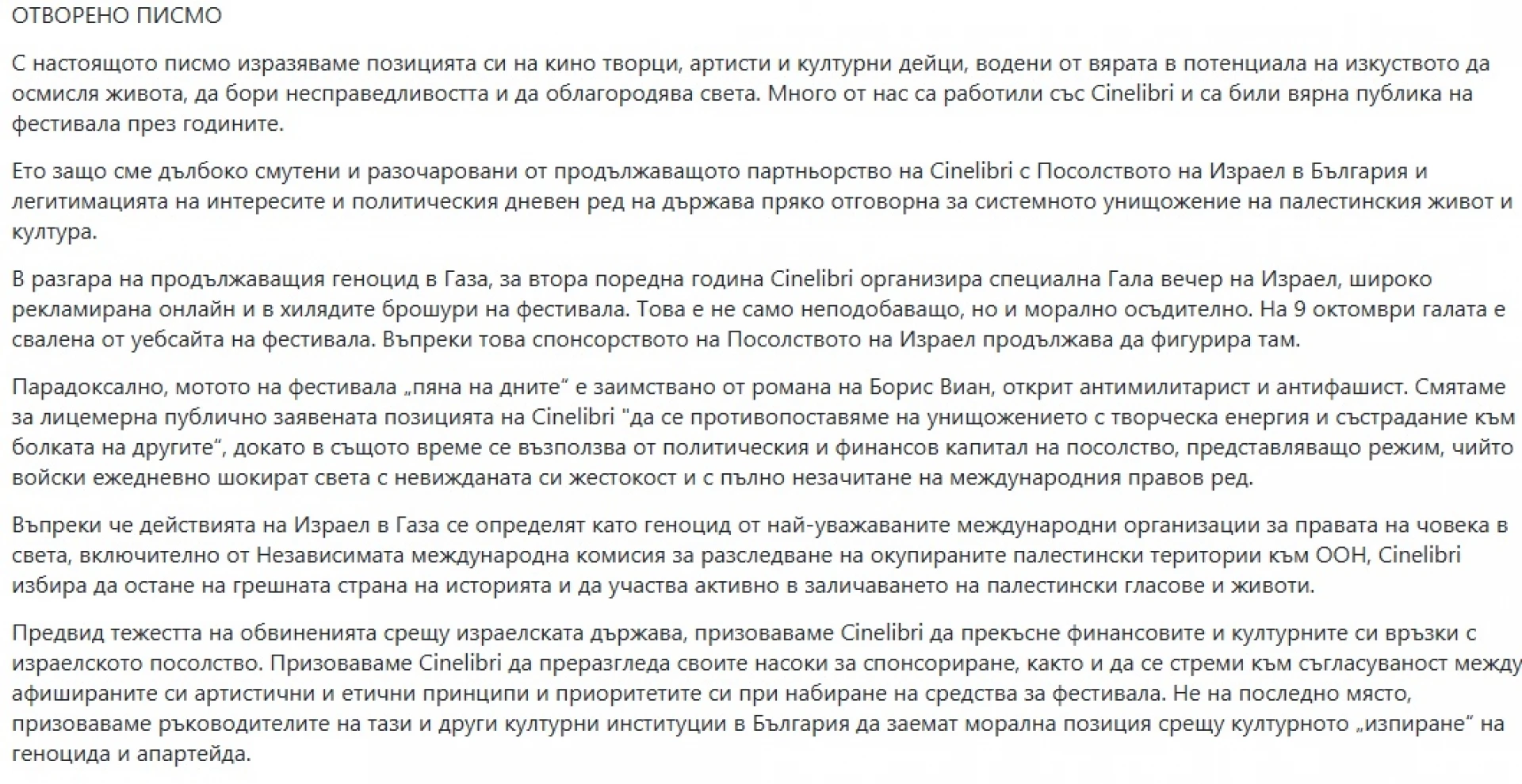 Сред авторите са познати имена като тези на режисьора Константин Божанов, оператора Крум Родригес, писателя Димитър Кенаров, журналиста Мария Черешева и др. Те пишат: "В разгара на продължаващия геноцид в Газа, за втора поредна година Cinelibri организира специална Гала вечер на Израел, широко рекламирана онлайн и в хилядите брошури на фестивала. Това е не само неподобаващо, но и морално осъдително. На 9 октомври галата е свалена от уебсайта на фестивала. Въпреки това спонсорството на Посолството на Израел продължава да фигурира там".