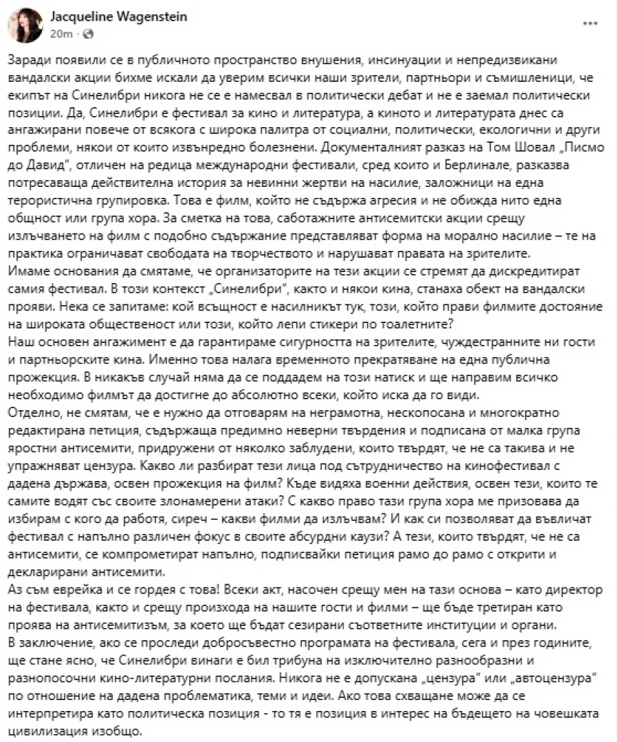 В края на своето писмено изявление Вагенщайн заявява, че се гордее със своя еврейски произход. "Всеки акт, насочен срещу мен на тази основа – като директор на фестивала, както и срещу произхода на нашите гости и филми – ще бъде третиран като проява на антисемитизъм, за което ще бъдат сезирани съответните институции и органи". Тя добавя, че досега в изданията на "Синелибри" "никога не е допускана "цензура" или "автоцензура" по отношение на дадена проблематика, теми и идеи. "Ако това схващане може да се интерпретира като политическа позиция - то тя е позиция в интерес на бъдещето на човешката цивилизация изобщо".