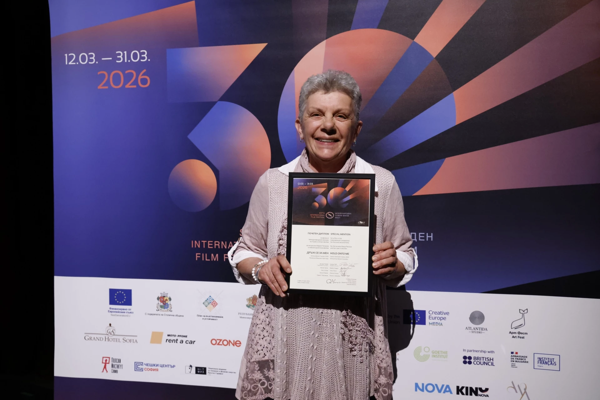 ПОЧЕТЕН ДИПЛОМ (Special Mention) бе присъден на Мария Петрова за ролята ѝ във филма "Дръж се за мен" (Кипър-Дания-Гърция) на режисьорката Мирсини Аристиду.