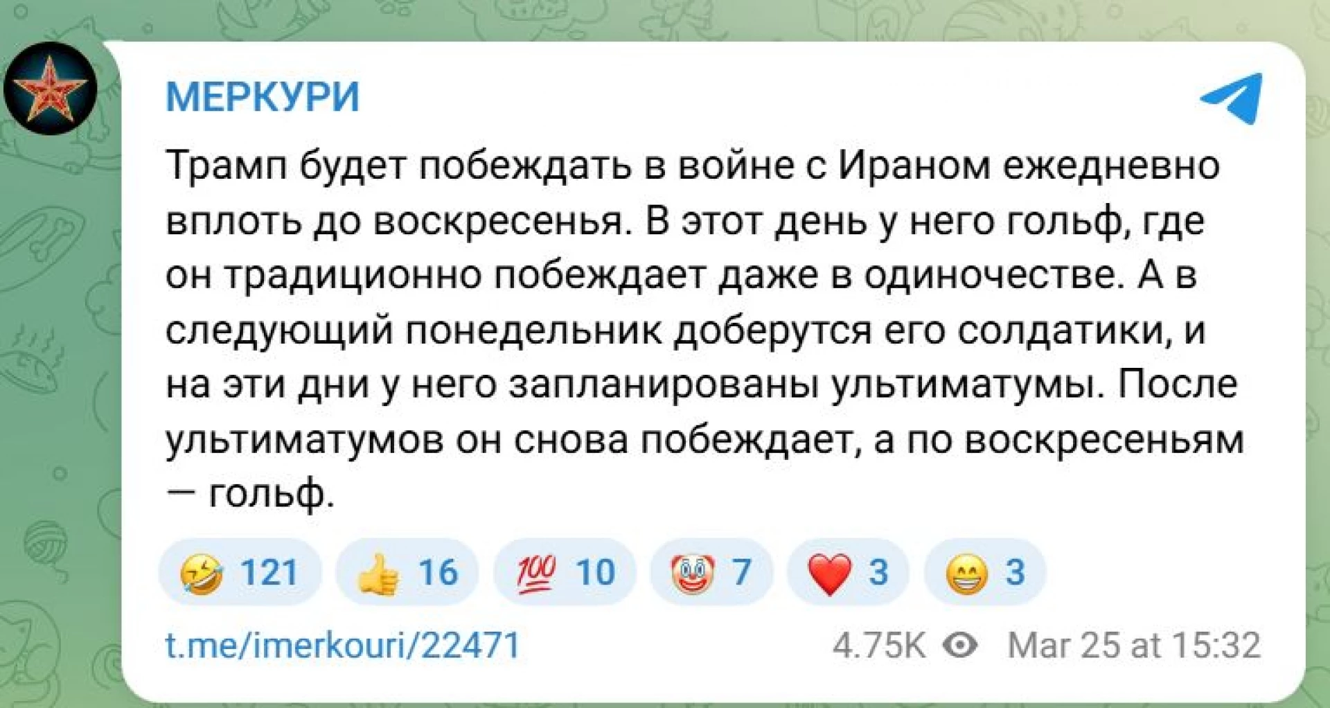 "Тръмп ще побеждава тази седмица във войната с Иран всеки ден до неделя. В този ден той играе голф и традиционно побеждава дори когато е сам. А следващия понеделник ще пристигнат неговите войници и за тези дни са му планирани ултиматуми. След ултиматумите той пак ще побеждава, а в неделя - пак голф." Цитатът е от руския телеграм канал "МЕРКУРИ" с близо 61 хиляди последователи и описва доста картинно ситуацията с развоя на войната в Иран поне от гледна точка на американския президент - той неизменно печели войната и разбива на 100% Иран ден след ден според собствените му изявления, но кой знае защо победеният Иран все така не е победен и все някой трябва да помага на Тръмп във войната, която спечели вече незнайно колко пъти.