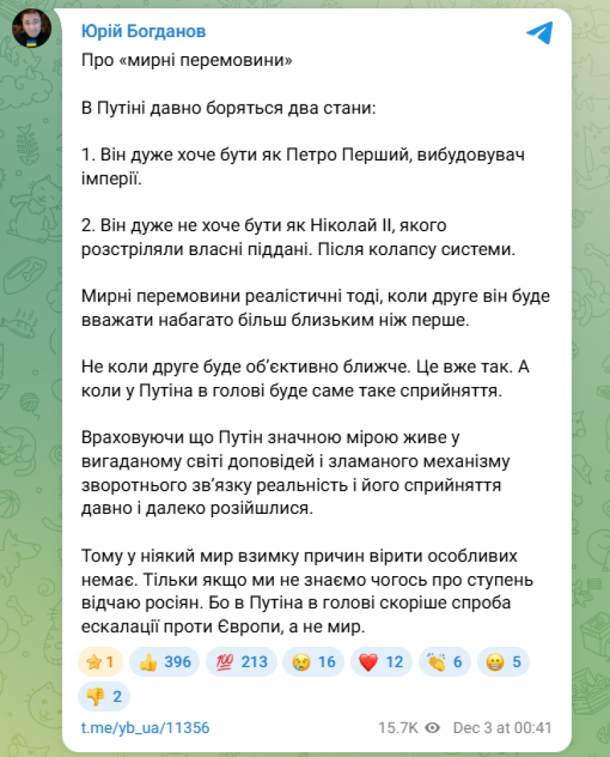 Горното е мнението на Юрий Богданов, украински анализатор и специалист по стратегически комуникации в областта на политиката, бизнеса и публичната администрация, в канала му в Telegram.