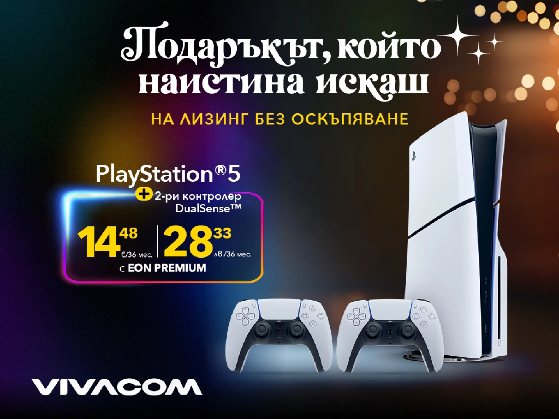 По време на празниците няма нищо по-хубаво от това да гледаме как един чисто нов свят оживява пред очите ни. Да се потопим в незабравими истории, да овладеем сложни магии и да опознаем най-различни герои. С PlayStation 5 това се превръща в реалност – вградената HDR технология и поддръжка на до 120 кадъра в секунда при 120Hz ни осигуряват не само плавна картина, наситени цветове и светкавични реакции, но и безброй часове забавление за цялото семейство. До 20.12 гейминг конзолата в комплект с 2-ри контролер DualSense е на лизинг без оскъпяване в сравнение с цената при еднократно плащане с 24-месечен абонамент за EON телевизия и Vivacom Fiber интернет. А това е перфектният подарък за всеки, който се нуждае от малко повече приключение в свободното си време.