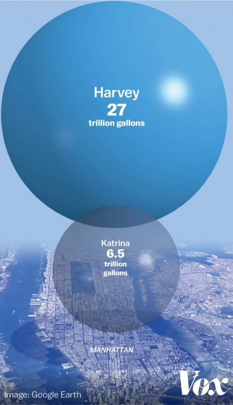 Визуализация на количеството валеж от ураганите „Харви“ и „Катрина“. 1 галон е равен на 3,78 литра. Източник: vox.com/science-and-health