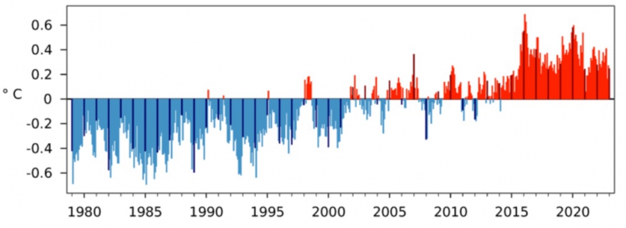 Фигура 1. Отклонение на средната температура на въздуха за януари 2023 г. спрямо нормата за 1991 – 2020 г. за цялото земно кълбо от 1979 г. насам. Източник: C3S/ECMWF.