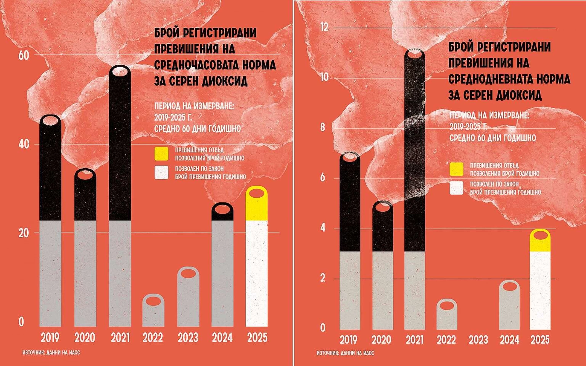 Това означава, че за 2025 г. в двете станции в Големо село са регистрирани 55 превишения на средночасовата норма за серен диоксид, като и в двете са отчетени повече от допустимите по закон 24 превишения. Колко замърсяване остава неотчетено за сметка на здравето на местните, е отворен въпрос.