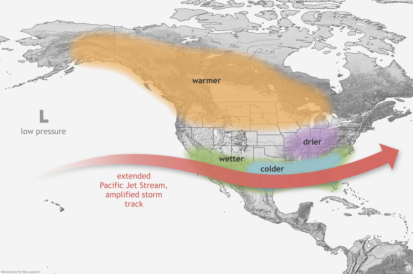 Под въздействието на Ел Ниньо, пасатите отслабват, така че източната част на Тихия океан, по протежение на западния бряг на Северна и Южна Америка, остава по-топла.