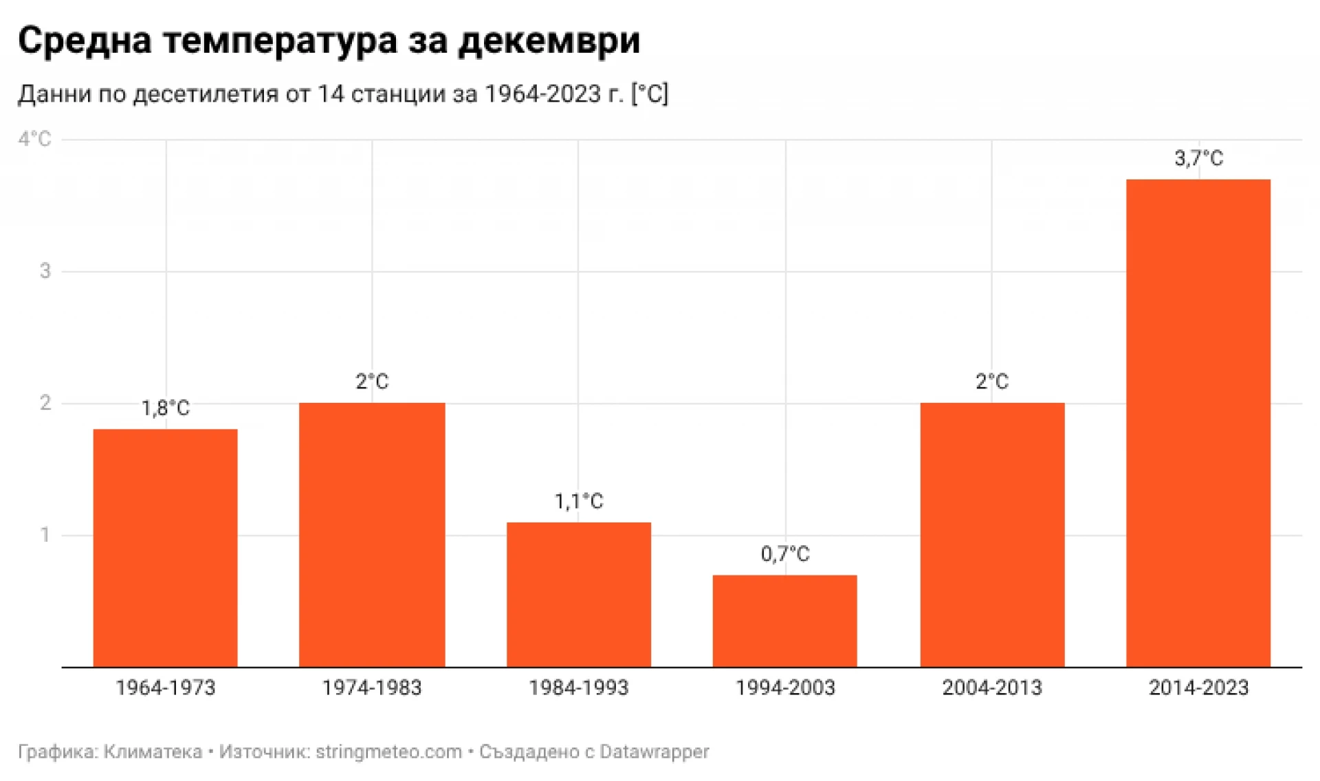 Фигура 2. Средната температура за декември от 14 български метеорологични станции по десетилетия от 1964 г. насам. Визуализация: "Климатека" - по данни от stringmeteo.com.*