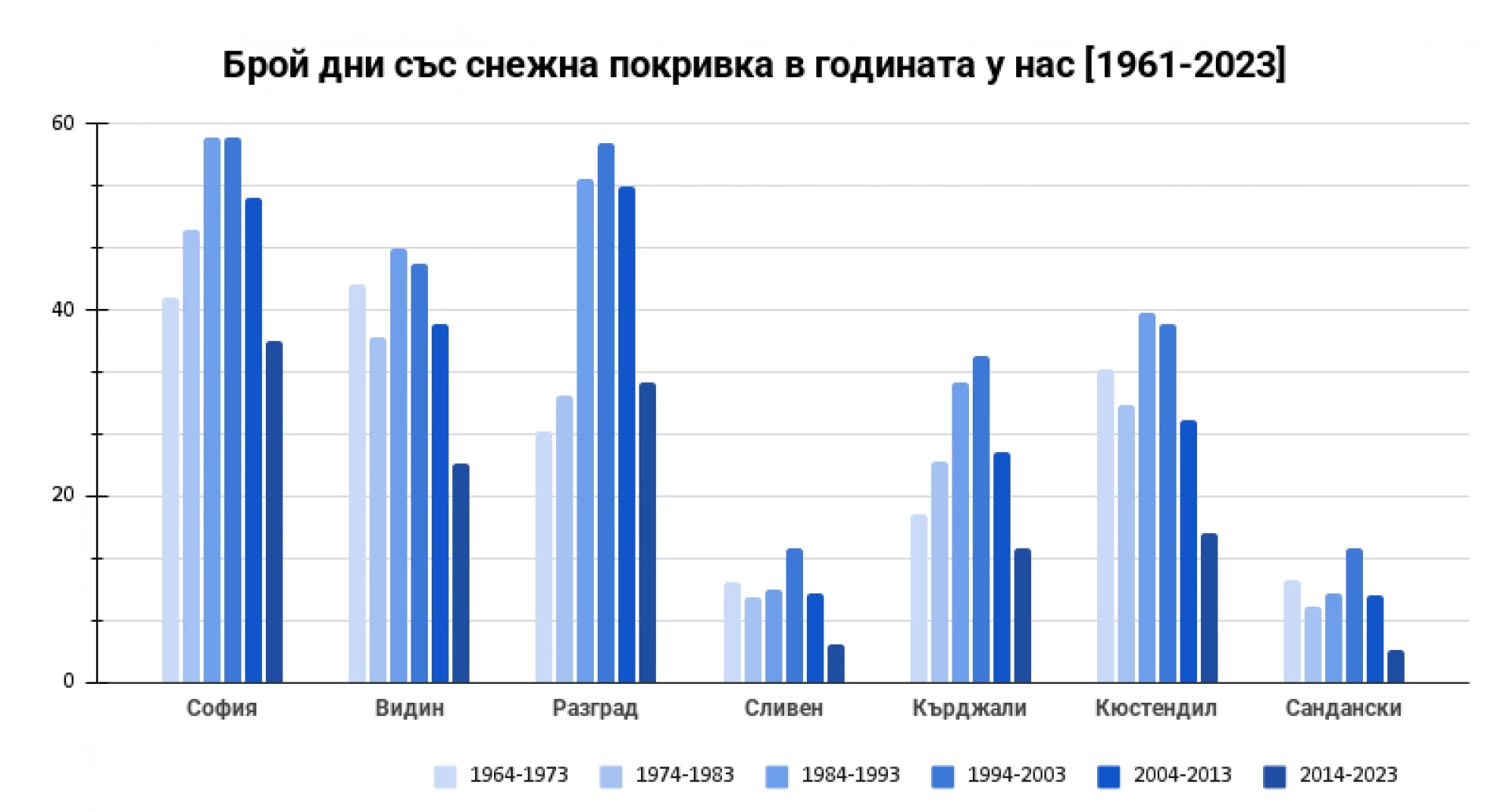 В същото време анализът на данните по десетилетия за 7 български града за периода 1964–2023 г. (фиг. 5) показва, че - след нарастването им към края на XX век - през последните 10–20 години броят на снежните дни намалява. През десетилетието 2014–2023 г. в 6 от 7-те разгледани станции се регистрира най-ниският брой дни със снежна покривка в сравнение с всички предходни десетилетия.